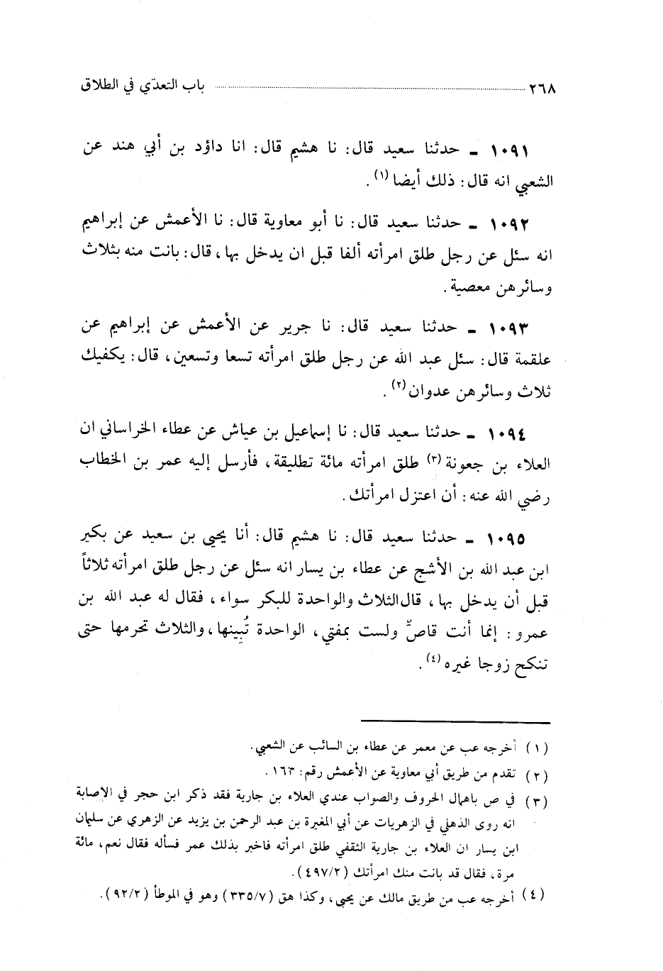 1093- حَدَّثَنَا جَرِيرٌ ، عَنِ الأَعْمَشِ ، عَنْ إِبْرَاهِيمَ ، عَنْ عَلْقَمَةَ قَالَ : سُئِلَ عَبْدُ اللهِ عَنْ رَجُلٍ طَلَّقَ امْرَأَتَهُ تِسْعًا وَتِسْعِينَ قَالَ : يَكْفِيكَ ثَلاَثٌ ، وَسَائِرُهُنَّ عُدْوَانٌ.
