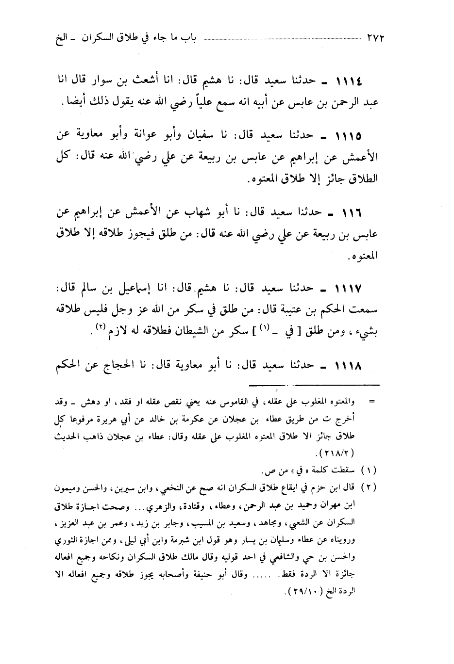 1117- حَدَّثَنَا هُشَيْمٌ ، قَالَ : أَخْبَرَنَا إِسْمَاعِيلُ بْنُ سَالِمٍ ، قَالَ : سَمِعْتُ الْحَكَمَ بْنَ عُتَيْبَةَ قَالَ : مَنْ طَلَّقَ فِي سُكْرٍ مِنَ اللهِ عَزَّ وَجَلَّ فَلَيْسَ طَلاَقُهُ بِشَيْءٍ ، وَمَنْ طَلَّقَ فِي سُكْرٍ مِنَ الشَّيْطَانِ فَطَلاَقُهُ لَهُ لاَزِمٌ.