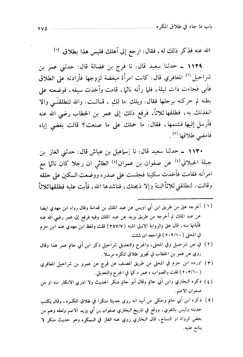 1129- حَدَّثَنَا فَرَجُ بْنُ فَضَالَةَ ، قَالَ : حَدَّثَنِي عُمَرُ بنُ شَرَاحِيلَ الْمَعَافِرِيُّ ، قَالَ : كَانَتِ امْرَأَةٌ مُبْغِضَةً لِزَوْجِهَا فَأَرَادَتْهُ عَلَى الطَّلاَقِ فَأَبَى فَجَاءَتْ ذَاتَ لَيْلَةٍ فَلَمَّا رَأَتْهُ نَائِمًا ، قَامَتْ وَأَخَذَتْ سَيْفَهُ ، فَوَضَعَتْهُ عَلَى بَطْنِهِ ثُمَّ حَرَّكَتْهُ بِرِجْلِهَا فَقَالَ : وَيْلَكِ مَا لَكِ ؟ قَالَتْ : وَاللَّهِ لَتُطَلِّقَنِّي وَإِلاَّ أَنْفَذْتُكَ بِهِ ، فَطَلَّقَهَا ثَلاَثًا ، فَرُفِعَ ذَلِكَ إِلَى عُمَرَ بْنِ الْخَطَّابِ رَضِيَ اللَّهُ عَنْهُ فَأَرْسَلَ إِلَيْهَا فَشَتَمَهَا ، فَقَالَ : مَا حَمَلَكِ عَلَى مَا صَنَعْتِ ؟ قَالَتْ بُغْضِي إِيَّاهُ فَأَمْضَى طَلاَقَهَا.