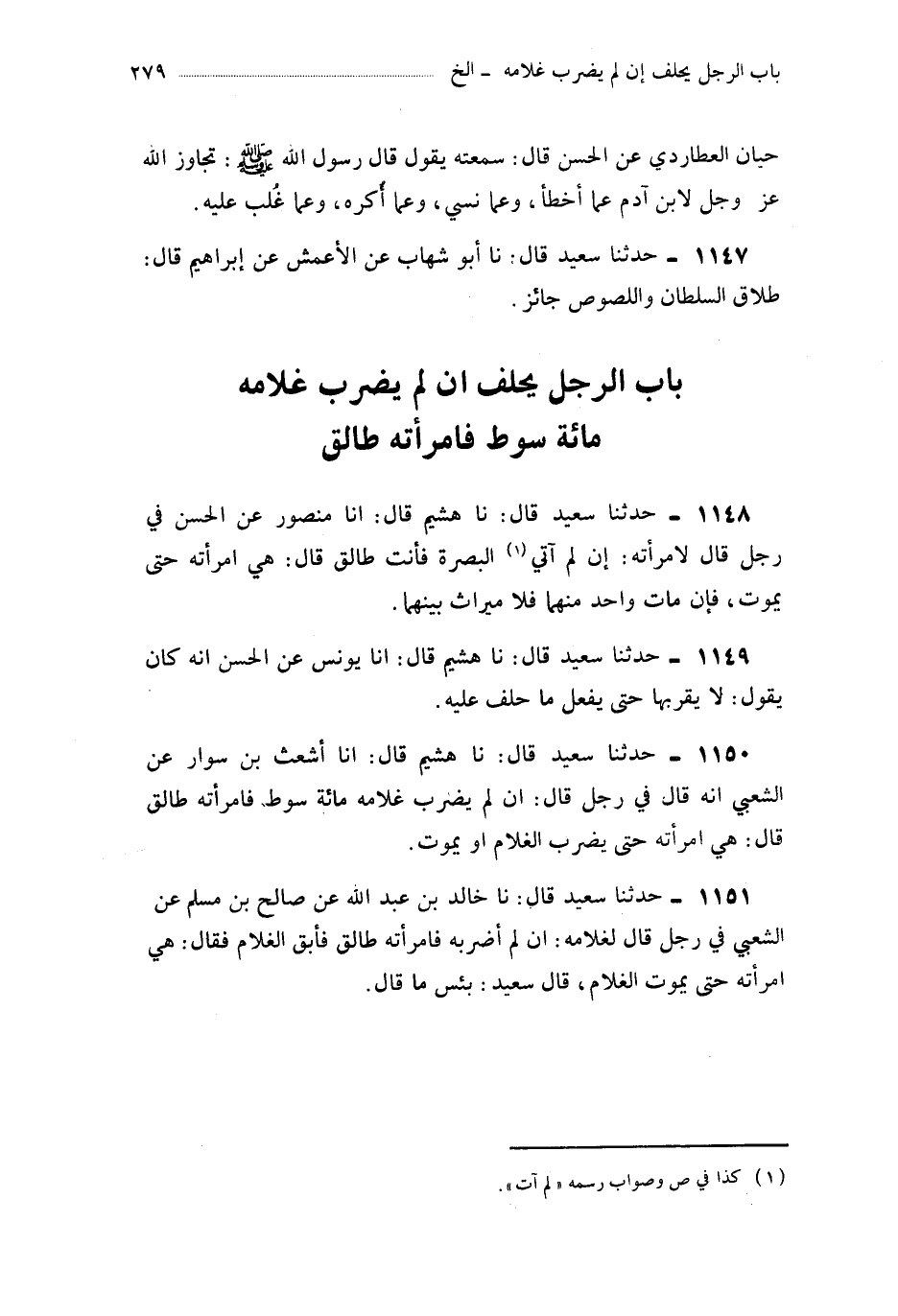 1150- حَدَّثَنَا هُشَيْمٌ ، قَالَ : أَخْبَرَنَا أَشْعَثُ بْنُ سَوَّارٍ ، عَنِ الشَّعْبِيِّ ، أَنَّهُ قَالَ فِي رَجُلٍ قَالَ : إِنْ لَمْ يَضْرِبْ غُلاَمَهُ مِائَةَ سَوْطٍ فَامْرَأَتُهُ طَالِقٌ قَالَ : هِيَ امْرَأَتُهُ حَتَّى يَضْرِبَ الْغُلاَمَ أَوْ يَمُوتَ.