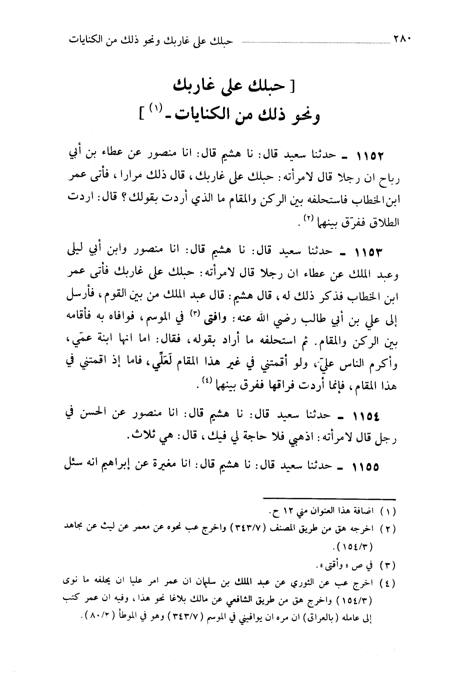 1152- حَدَّثَنَا هُشَيْمٌ ، قَالَ : أَخْبَرَنَا مَنْصُورٌ ، عَنْ عَطَاءِ بْنِ أَبِي رَبَاحٍ ، أَنَّ رَجُلاً قَالَ لاِمْرَأَتِهِ : حَبْلُكِ عَلَى غَارِبِكِ ، قَالَ ذَلِكَ مِرَارًا ، فَأَتَى عُمَرَ بْنَ الْخَطَّابِ فَاسْتَحْلَفَهُ بَيْنَ الرُّكْنِ وَالْمَقَامِ : مَا الَّذِي أَرَدْتَ بِقَوْلِكَ ؟ قَالَ : أَرَدْتُ الطَّلاَقَ ، فَفَرَّقَ بَيْنَهُمَا.