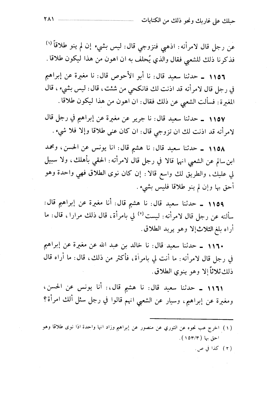 1159- حَدَّثَنَا هُشَيْمٌ ، قَالَ : أَخْبَرَنَا مُغِيرَةُ ، عَنْ إِبْرَاهِيمَ ، قَالَ : سَأَلْتُهُ عَنْ رَجُلٍ قَالَ لاِمْرَأَتِهِ : لَيْسَتْ لِي بِامْرَأَةٍ ، قَالَ ذَلِكَ مِرَارًا ، قَالَ : مَا أَرَاهُ بَلَغَ الثَّلاَثَ إِلاَّ وَهُوَ يُرِيدُ الطَّلاَقَ.