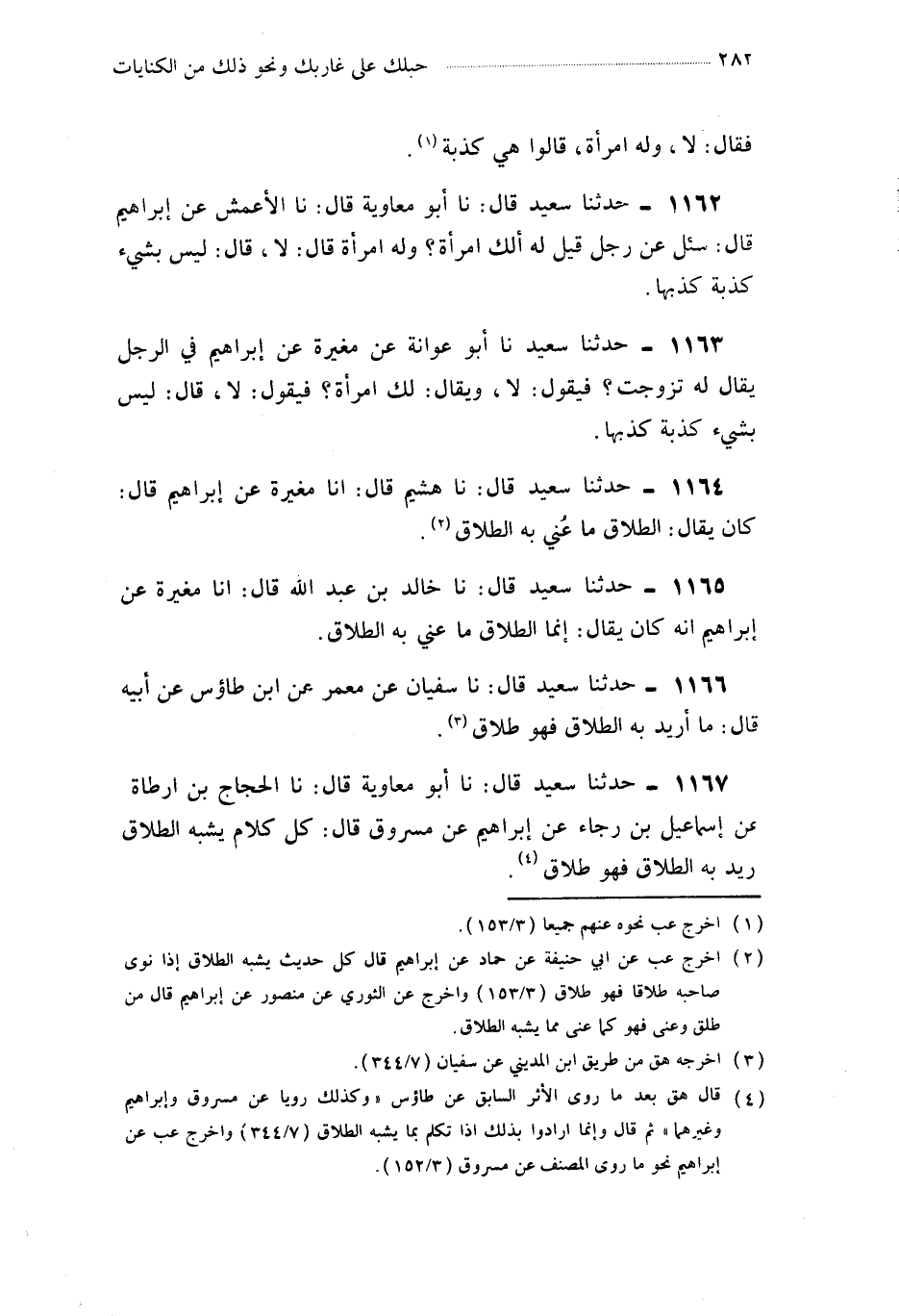 1167- حَدَّثَنَا أَبُو مُعَاوِيَةَ ، قَالَ : حَدَّثَنَا الْحَجَّاجُ بْنُ أَرْطَاةَ ، عَنْ إِسْمَاعِيلَ بْنِ رَجَاءٍ ، عَنْ إِبْرَاهِيمَ ، عَنْ مَسْرُوقٍ قَالَ : كُلُّ كَلاَمٍ يُشْبِهُ الطَّلاَقَ رِيدَ بِهِ الطَّلاَقُ فَهُوَ طَلاَقٌ.