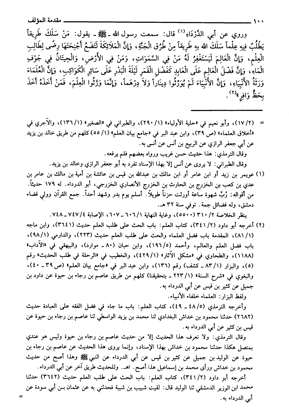وروي عن أبي الدرداء قال: سمعت رسول الله - صلى الله عليه وسلم- يقول: من سلك طريقاً يطلب فيه علماً سلك الله به طريقاً من طرق الجنة، وإن الملائكة لتضع أجنحتها رضىً لطالب العلم، وإن العالم ليستغفر له من في السموات، ومن في الأرض، والحيتان في جوف الماء، وإن فضل العالم على العابد كفضل القمر ليلة البدر على سائر الكواكب، وإن العلماء ورثة الأنبياء، وإن الأنبياء لم يورثوا ديناراً ولا درهما، وإنما ورثوا العلم، فمن أخذه أخذ بحظ وافر".