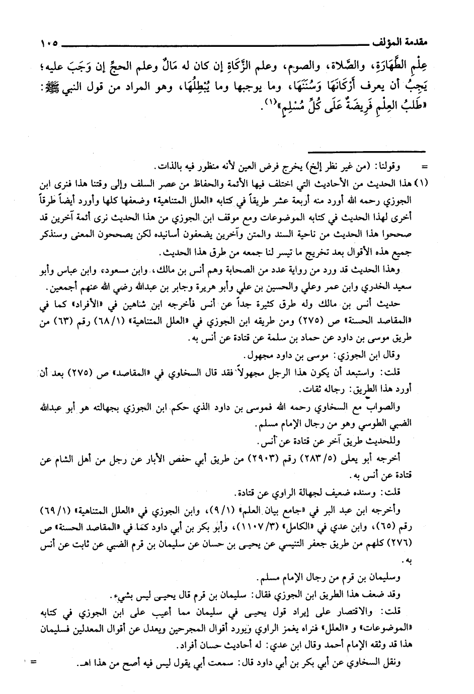 علم الطهارة، والصلاة، والصوم، وعلم الزكاة إن كان له مالٌ وعلم الحج إن وجب عليه؛ يجب أن يعرف أركانها وسننها، وما يوجبها وما يبطلها، وهو المراد من قول النبي صلى الله عليه وسلم: "طلب العلم فريضةٌ على كل مسلم".