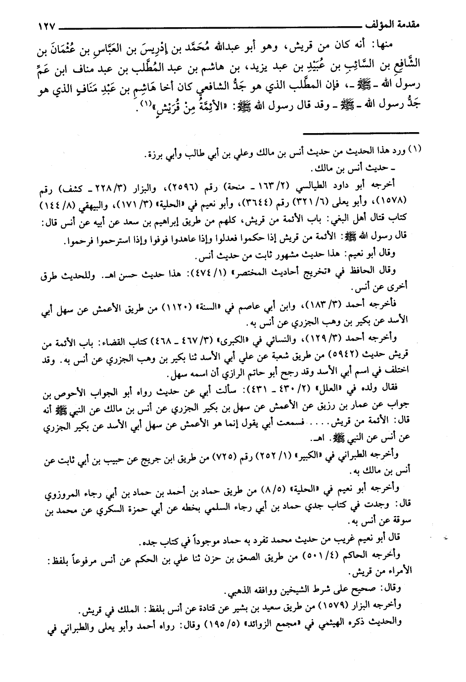 منها: أنه كان من قريش، وهو أبو عبد الله محمد بن إدريس بن العباس بن عثمان بن الشافع بن السائب بن عبيد بن عبد يزيد، بن هاشم بن عبد المطلب بن عبد مناف ابن عم رسول الله - صلى الله عليه وسلم-، فإن المطلب الذي هو جد الشافعي كان أخا هاشم بن عبد منافٍ الذي هو جدُّ رسول الله - صلى الله عليه وسلم- وقد قال رسول الله صلى الله عليه وسلم: "الأئمة من قريشٍ".