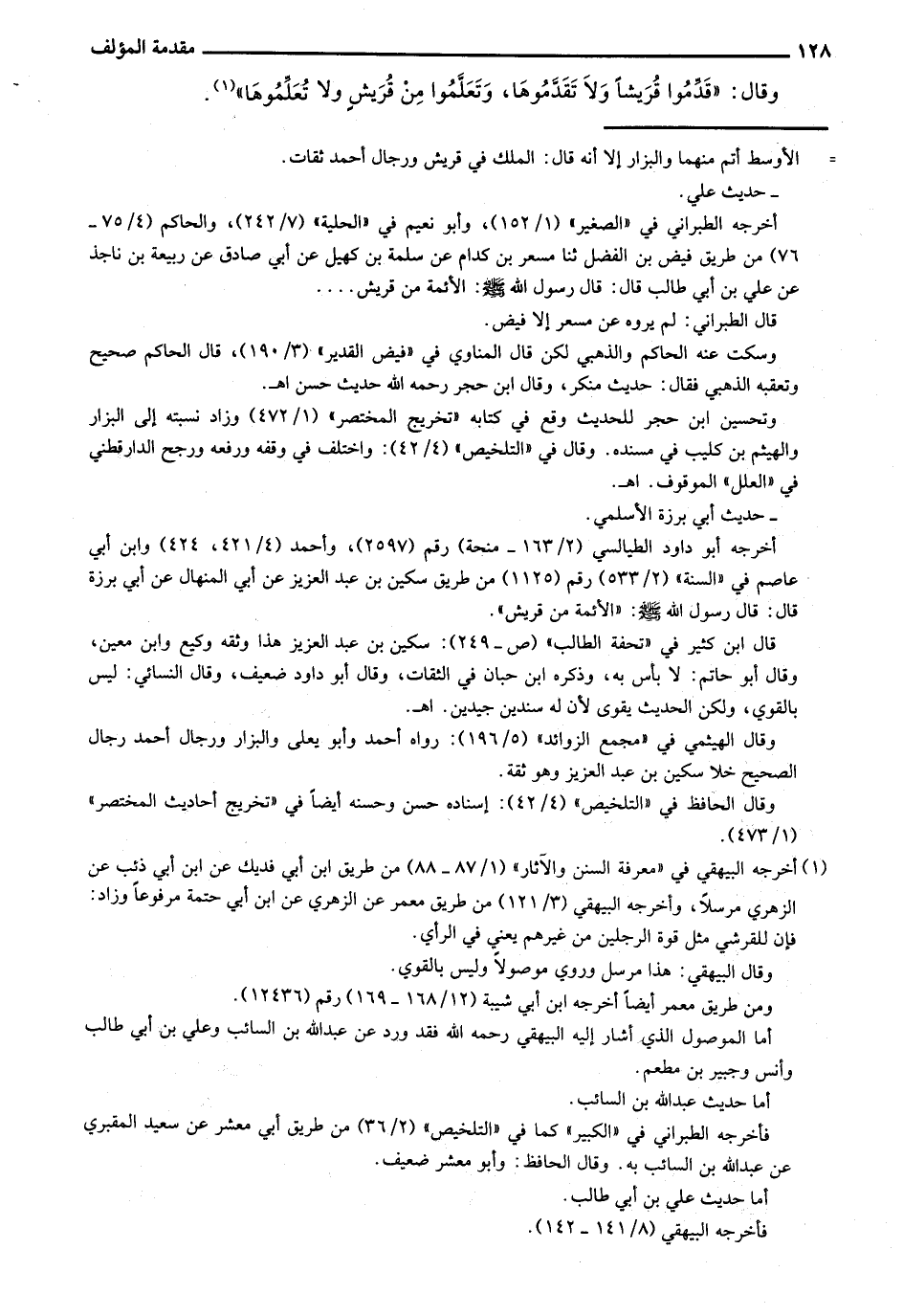 وقال: "قدموا قريشاً ولا تقدموها، وتعلموا من قريشٍ ولا تعلموها".