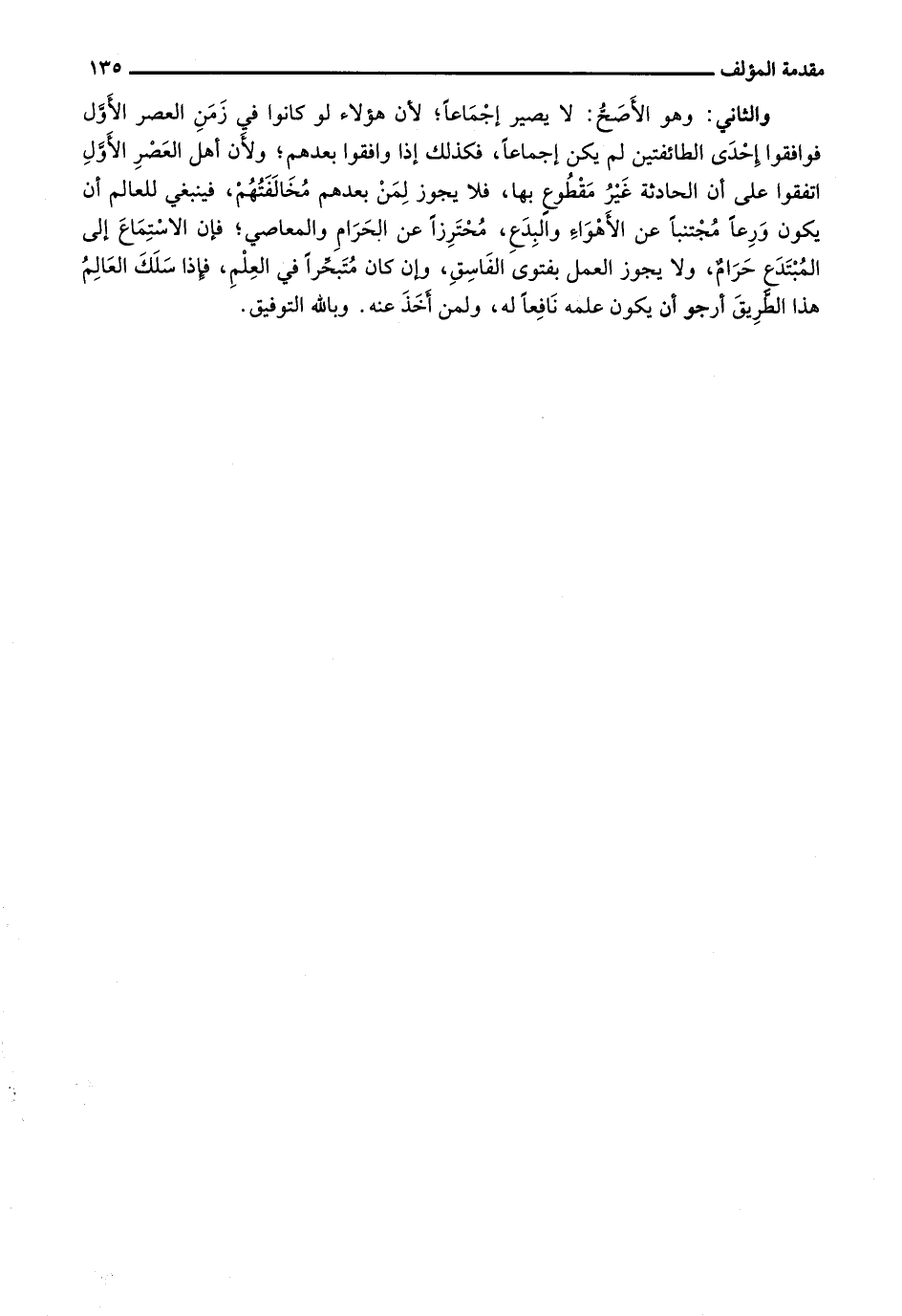 والثاني: وهو الأصح: لا يصير إجماعاً؛ لأن هؤلاء لو كانوا في زمن العصر الأول فوافقوا إحدى الطائفتين لم يكن إجماعاً، فكذلك إذا وافقوا بعدهم؛ ولأن أهل العصر الأول اتفقوا على أن الحادثة غيرُ مقطوعٍ بها، فلا يجوز لمن بعدهم مخالفتهم، فينبغي للعالم أن يكون ورعاً مجتنباً عن الأهواء والبدع، محترزاً عن الحرام والمعاصي؛ فإن الاستماع إلى المبتدع حرامٌ، ولا يجوز العمل بفتوى الفاسق، وإن كان متبحراً في العلم، فإذا سلك العالم هذا الطريق أرجو أن يكون علمه نافعاً له، ولمن أخذ عنه. وبالله التوفيق.
