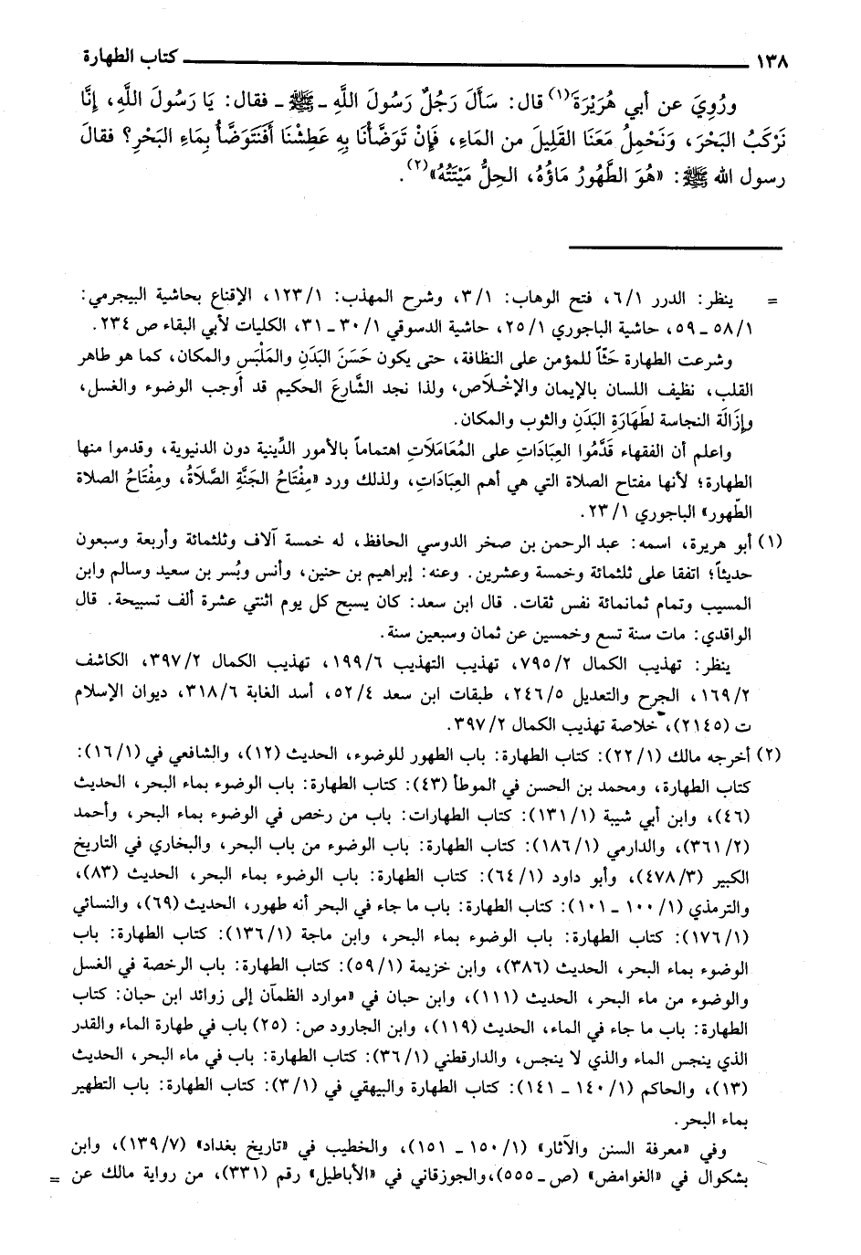 وروي عن أبي هريرة قال: سأل رجلٌ رسول الله - صلى الله عليه وسلم - فقال: يا رسول الله، إنا نركب البحر، ونحمل معنا القليل من الماء، فإن توضأنا به عطشنا أفنتوضأ بماء البحر؟ فقال رسول الله صلى الله عليه وسلم: "هو الطهور ماؤه، الحل ميتته".