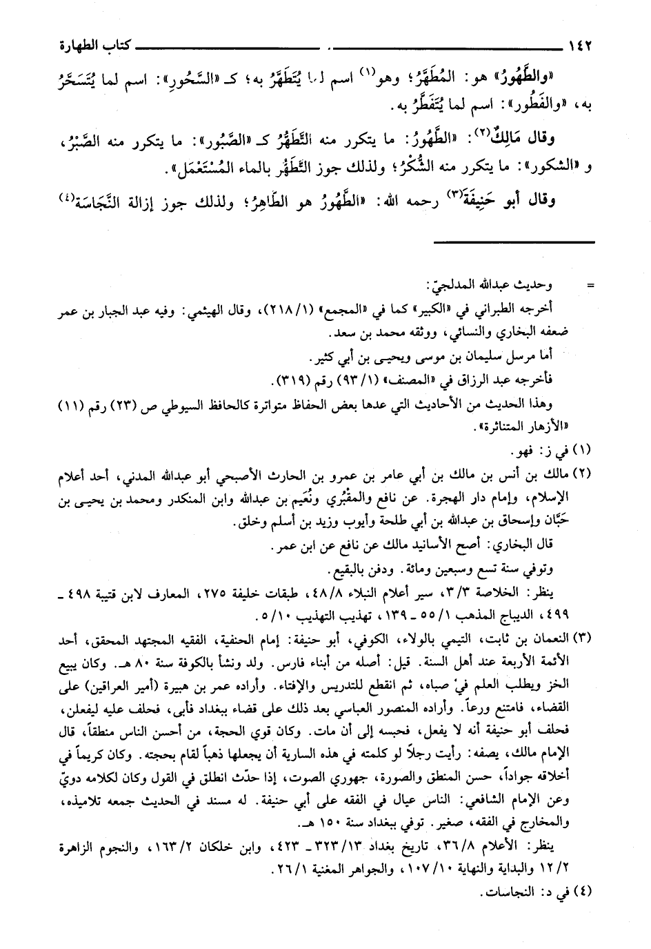 وقال أبو حنيفة رحمه الله: "الطهور هو الطاهر؛ ولذلك جوز إزالة النجاسة