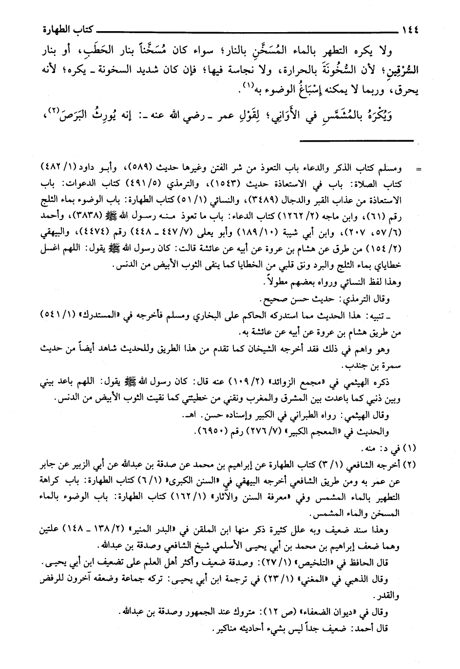 ويكره بالمشمس في الأواني؛ لقول عمر - رضي الله عنه-: إنه يورث البرص،