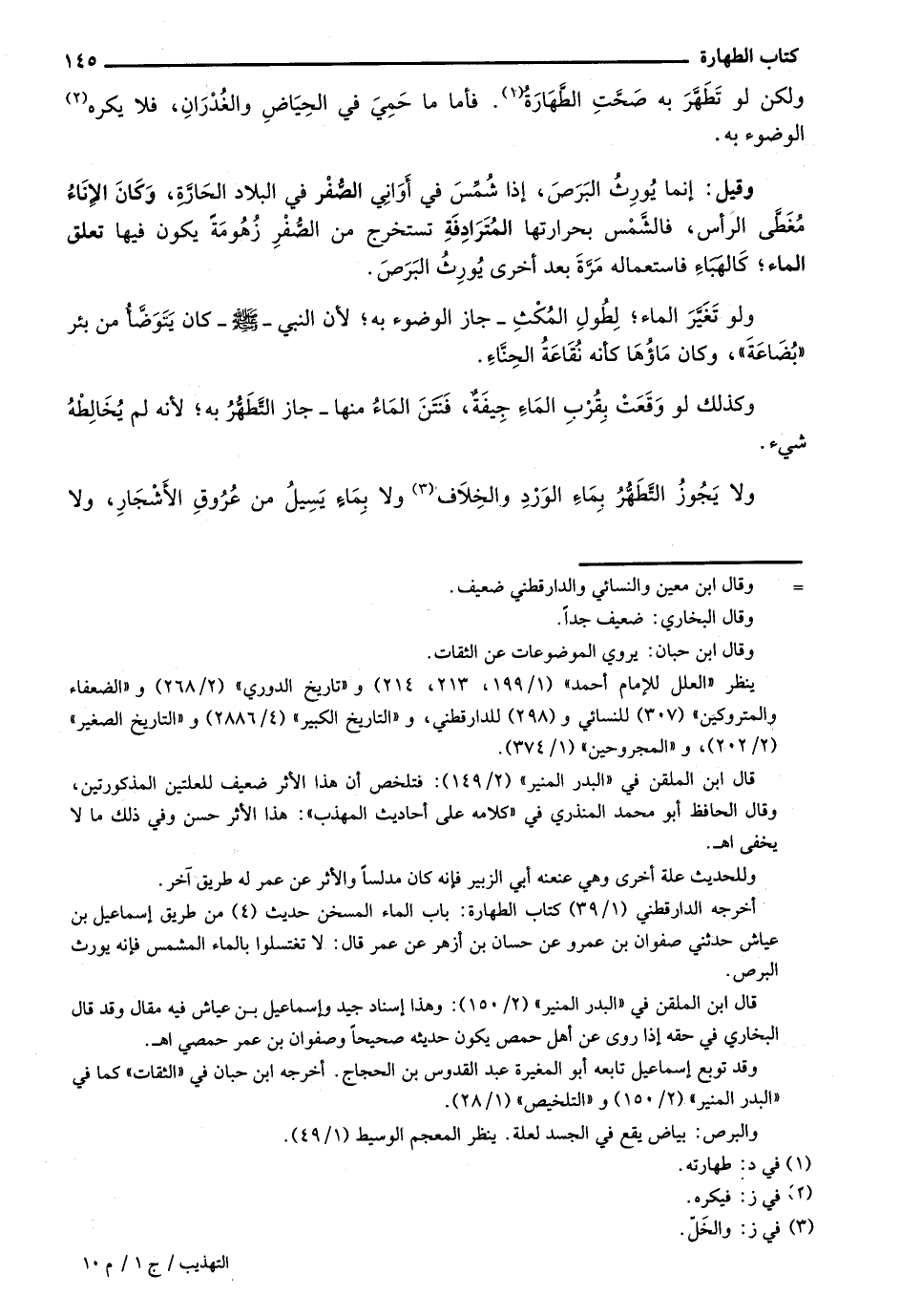 وقيل: إنما يورث البرص، إذا شُمِّسَ في أواني الصفر في البلاد الحارة، وكان الإناء مغطى الرأس، فالشمس بحرارتها المترادفة تستخرج من الصفر زهومةً يكون فيها تعلق الماء؛ كالهباء فاستعماله مرة بعد أخرى يورث البرص.