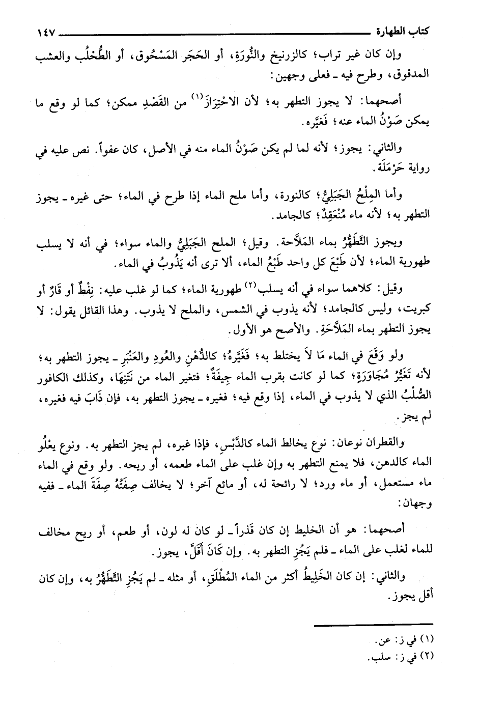 وقيل: كلاهما سواء في أنه يسلب طهورية الماء؛ كما لو غلب عليه: نِفطٌ أو قارٌ أو كبريت، وليس كالجامد؛ لأنه يذوب في الشمس، والملح لا يذوب. وهذا القائل يقول: لا يجوز التطهر بماء الملاحة. والأصح هو الأول.