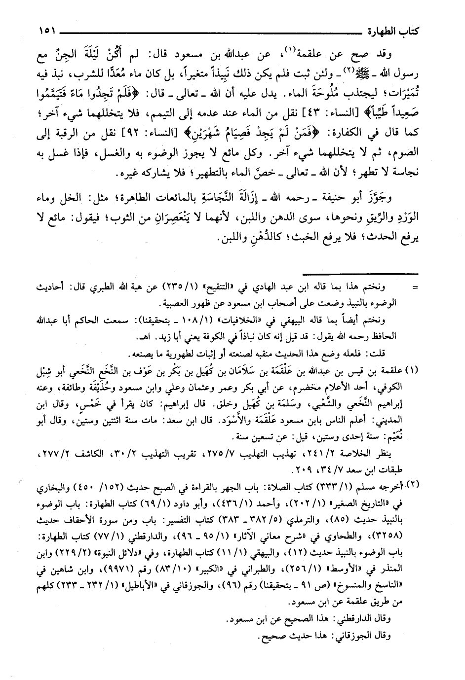 وقد صح عن علقمة, عن عبد الله بن مسعود قال: لم أكن ليلة الجن مع رسول الله - صلى الله عليه وسلم - ولئن ثبت لم يكن ذلك نبيذًا متغيرًا, بل كان ماء مُعدًّا للشرب, نبذ فيه تميرات؛ ليجتذب مُلوحة الماء. يدل عليه أن الله - تعالى - قال: {فَلَمْ تَجِدُوا مَاء فَتَيَمَّمُوا صَعِيدًا طَيِّبًا} [النساء: 43] نقل من الماء عند عدمه إلى التيمم, فلا يتخللهما شيء آخر؛ كما قال في الكفارة: {فَمَن لَّمْ يَجِدْ فَصِيَامُ شَهْرَيْنِ} [النساء: 92] نقل من الرقبة إلى الصوم, ثم لا يتخللهما شيء آخر. وكل مائع لا يجوز الوضوء به والغسل, فإذا غسل به نجاسة لا تطهر؛ لأن الله - تعالى - خصَّ الماء بالتطهير؛ فلا يشاركه غيره.