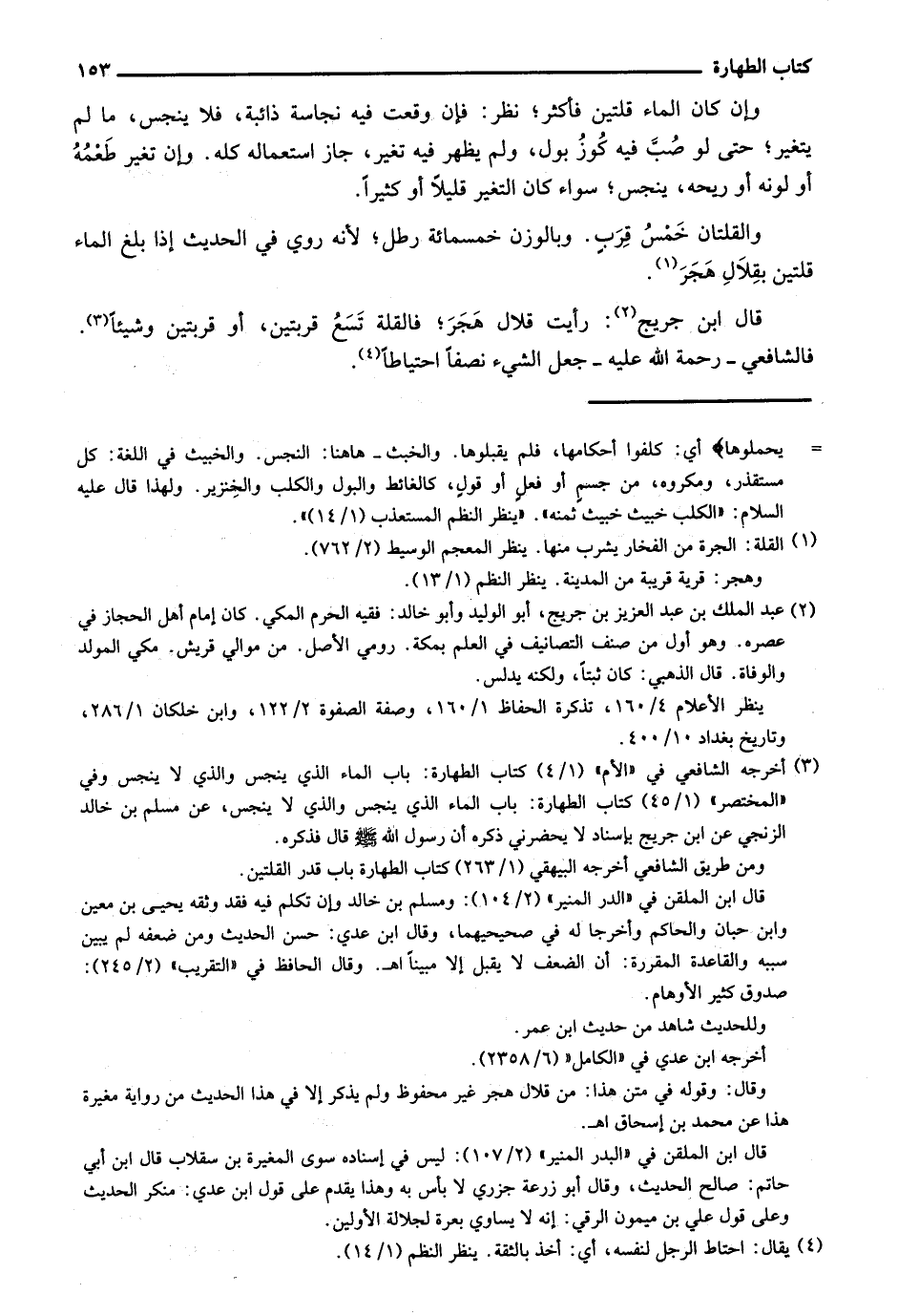 قال ابن جريج: رأيت قلال هجر؛ فالقلة تسع قربتين, أو قربتين وشيئًا. فالشافعي - رحمة الله عليه - جعل الشيء نصفًا احتياطًا.