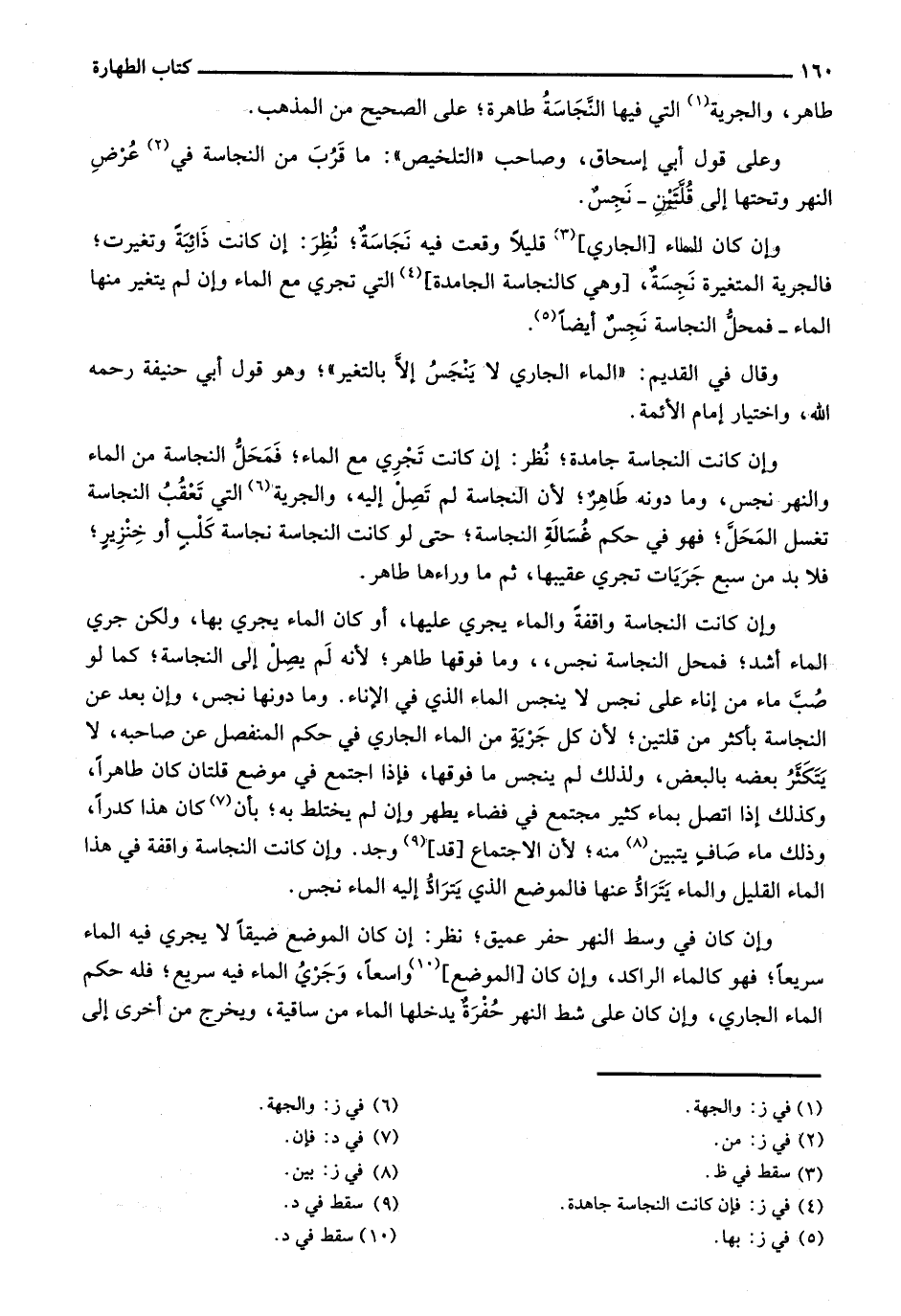 وإن كانت النجاسة واقفةً والماء يجري عليها, أو كان الماء يجري بها, ولكن جري الماء أشد؛ فمحل النجاسة نجس, وما فوقها طاهر؛ لأنه لم يصل إلى النجاسة؛ كما لو صُبَّ ماء من إناء على نجس لا ينجس الماء الذي في الإناء. وما دونها نجس, وإن بعد عن النجاسة بأكثر من قلتين؛ لأن كل جريةٍ من الماء الجاري في حكم المنفصل عن صاحبه, لا يتكثَّر بعضه بالبعض, ولذلك لم ينجس ما فوقها, فإذا اجتمع في موضع قلتان كان طاهرًا, وكذلك إذا اتصل بماء كثير مجتمع في فضاء يطهر وإن لم يختلط به؛ بأن كان هذا كدرًا, وذلك ماء صافٍ يتبين منه؛ لأن الاجتماع [قد] وجد. وإن كانت النجاسة واقفة في هذا الماء القليل والماء يترادُّ عنها فالموضع الذي يترادُّ إليه الماء نجس.