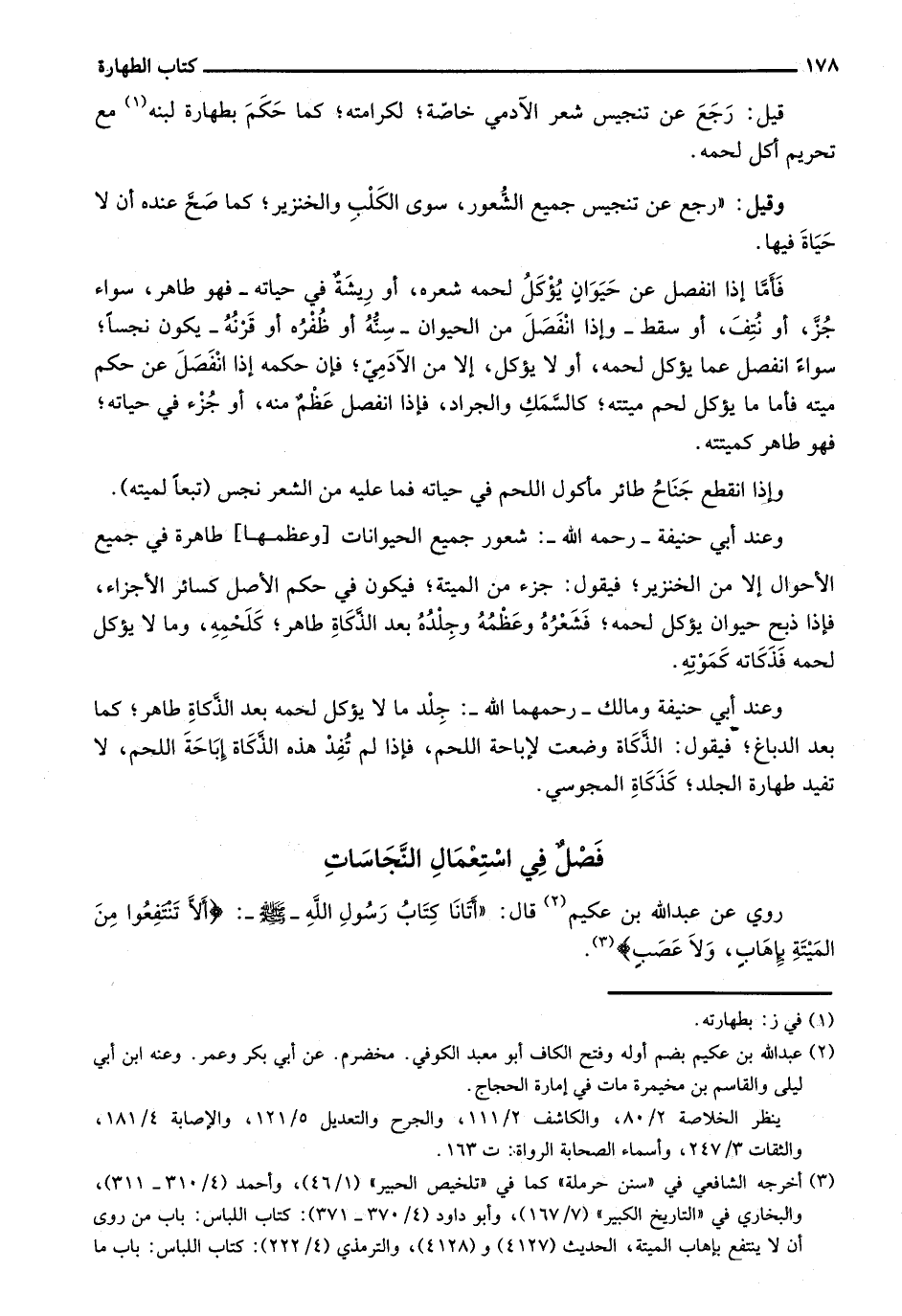 روي عن عبد الله بن عكيم قال: "أتانا كتاب رسول الله - صلى الله عليه وسلم-: "ألا تنتفعوا من الميتة بإهابٍ، ولا عصب".