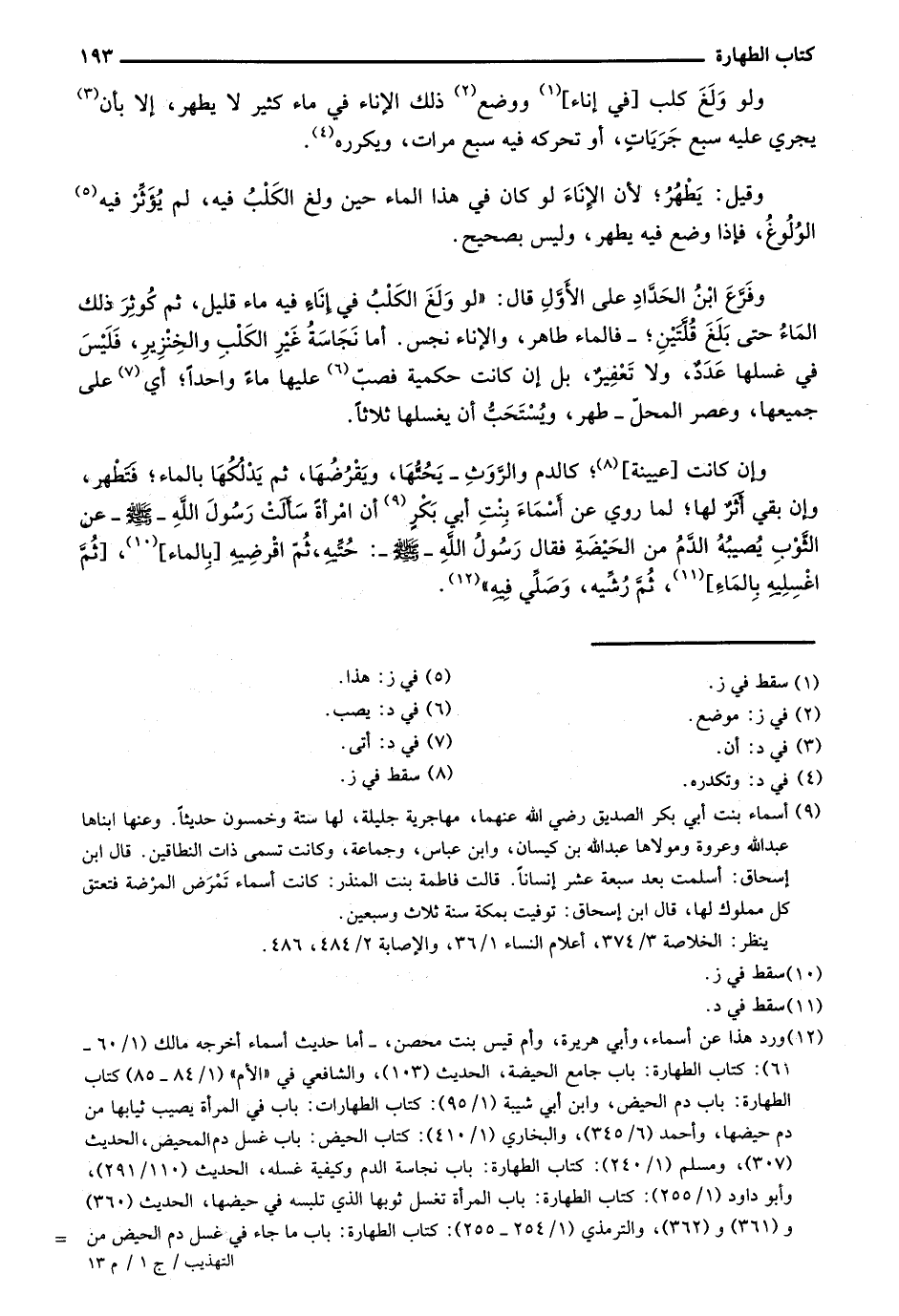 وفرع ابن الحداد على الأول قال: "لو ولغ الكلب في إناءٍ فيه ماء قليل، ثم كُوثِرَ ذلك الماء حتى بلغ قلتين؛ - فالماء طاهر، والإناء نجس. أما نجاسة غير الكلب والخنزير، فليس في غسلها عددٌ، ولا تعفيرٌ، بل إن كانت حكمية فصب عليها ماءً واحداً؛ أي على جميعها، وعصر المحل- طهر، ويستحب أن يغسلها ثلاثاً.