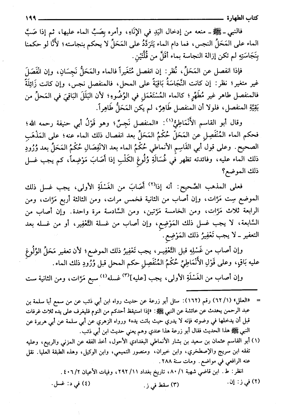 وقال أبو القاسم الأنماطي: "المنفصل نجسٌ؛ وهو قول أبي حنيفة رحمه الله؛ فحكم الماء المنفصل عن المحل حكم المحل بعد انفصال ذلك الماء عنه؛ على المذهب الصحيح. وعلى قول أبي القاسم الأنماطي حكم الماء بعد الانفصال حكم المحل بعد ورود ذلك الماء عليه، وفائدته تظهر في غسالة ولوغ الكلب إذا أصاب موضعاً، كم يجب غسل ذلك الموضع؟