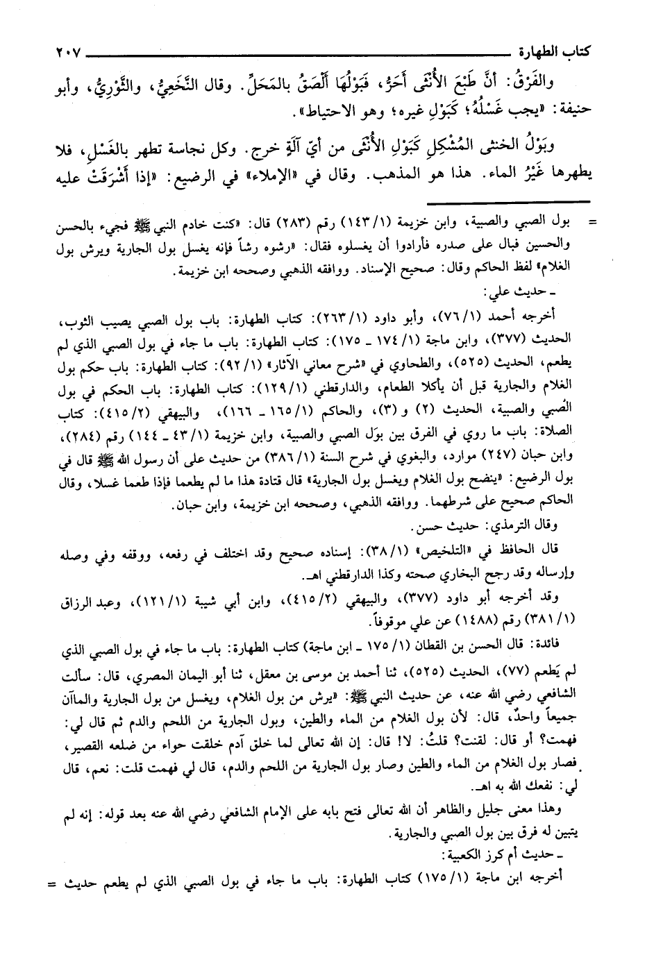 وبول الخنثى المشكل كبول الأنثى من أي آلةٍ خرج. وكل نجاسة تطهر بالغسل، فلا يطهرها غير الماء. هذا هو المذهب. وقال في "الإملاء" في الرضيع: "إذا أشرقت عليه