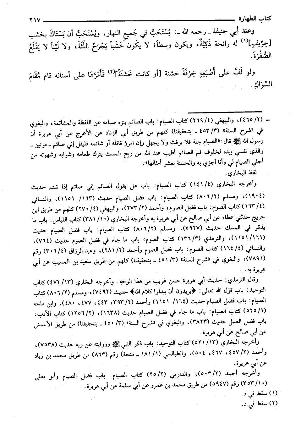 وعند أبي حنيفة- رحمه الله-: يستحب في جميع النهار، ويستحب أن يستاك بخشب [حريف] له رائحة ذكية، ويكون وسطاً؛ لا يكون خشباً يجرح اللثة، ولا ليناً لا يقلع الصفرة.