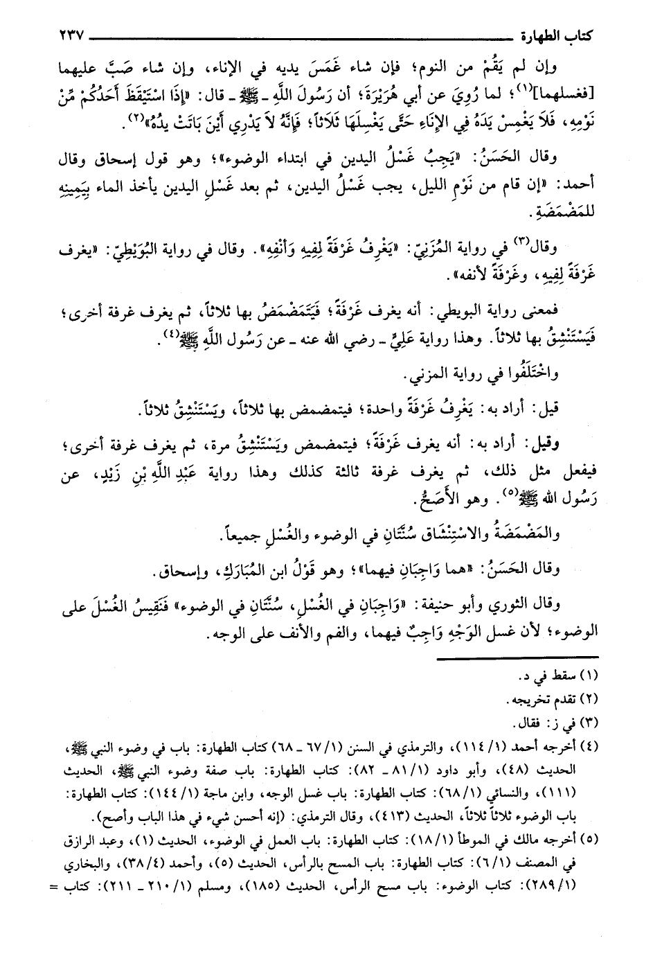 وقال في رواية المزني: "يغرف غرفة لفيه وأنفه". وقال في رواية البويطي: "يغرف غرفةً لفيه، وغرفة لأنفه".