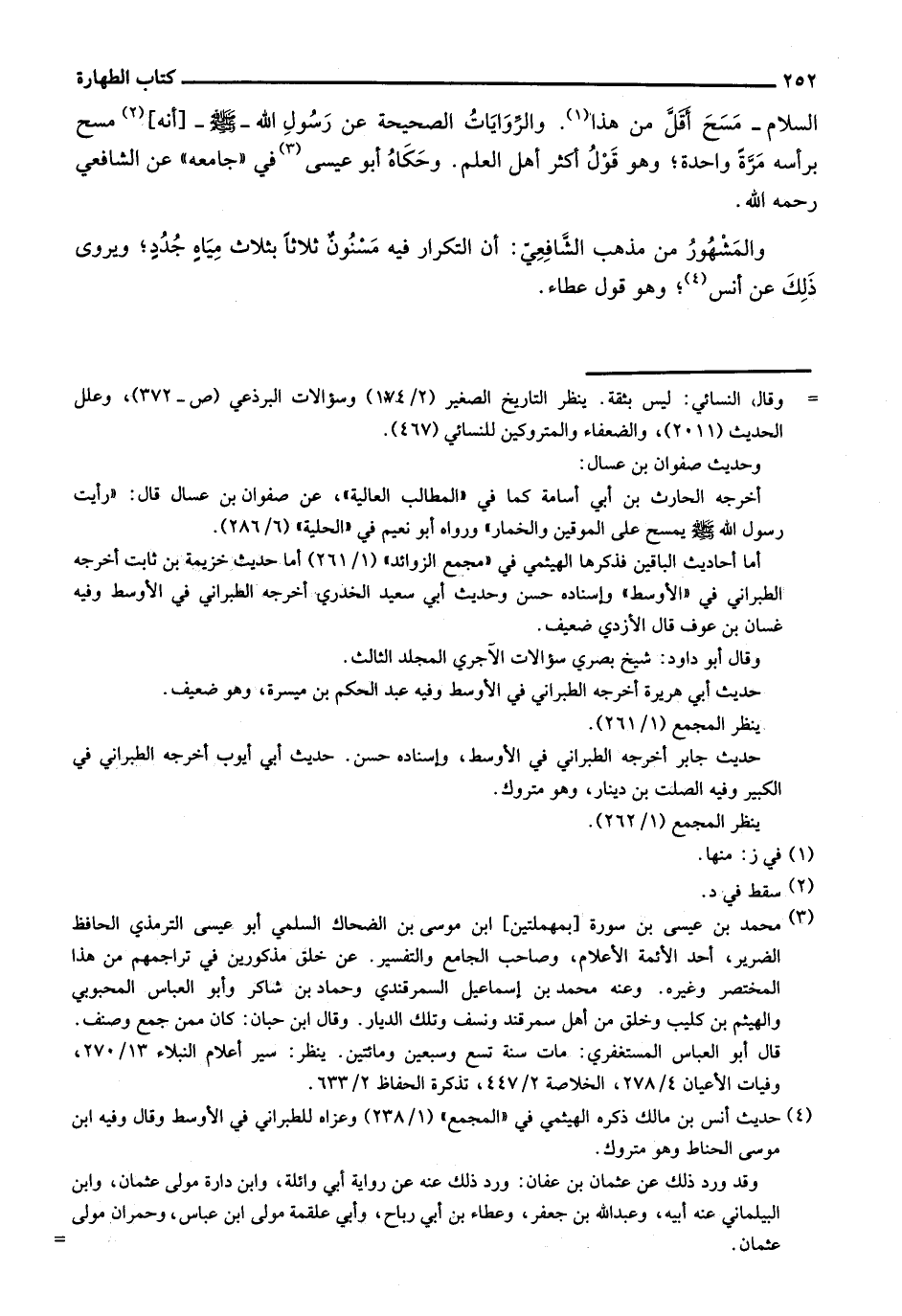 السلام- مسح أقل من هذا. والروايات الصحيحة عن رسول الله- صلى الله عليه وسلم -[أنه] مسح برأسه مرةً واحدة؛ وهو قول أكثر أهل العلم. وحكاه أبو عيسى في "جامعه" عن الشافعي رحمه الله.