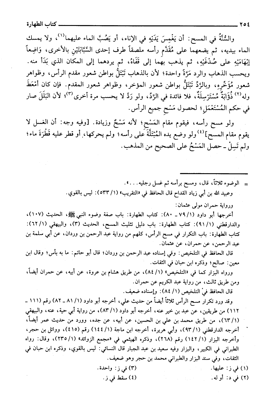 والسنة في المسح: أن يغمس يديه في الإناء، أو يصب الماء عليهما، ولا يمسك الماء بيديه، ثم يضعهما على مقدم رأسه ملصقاً طرف إحدى السبابتين بالأخرى، واضعاً إبهاميه على صدغيه، ثم يذهب بهما إلى قفاه، ثم يردهما إلى المكان الذي بدأ منه. ويحسب الذهاب والرد مرة واحدة؛ لأن بالذهاب تبتل بواطن شعور مقدم الرأس، وظواهر شعور مؤخره، وبالرد تبتل بواطن شعور المؤخر، وظواهر شعور المقدم. فإن كان أمعط وله ذؤابةٌ مسترسلةٌ؛ فلا فائدة في الرد، ولو رد لا يحسب مرة أخرى؛ لأن البلل صار في حكم المستعمل؛ لحصول مسح جميع الرأس.