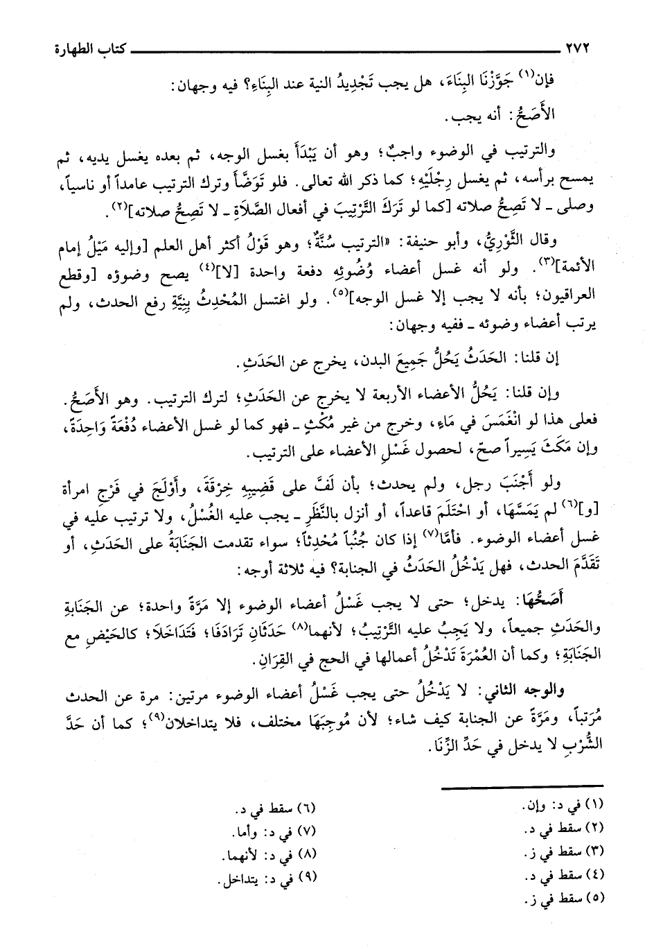 وقال الثوري، وأبو حنيفة: "الترتيب سنةٌ؛ وهو قول أكثر أهل العلم [وإليه ميل إمام الأئمة]. ولو أنه غسل أعضاء وضوئه دفعة واحدة [لا] يصح وضوؤه [وقطع العراقيون؛ بأنه لا يجب إلا غسل الوجه]. ولو اغتسل المحدث بنية رفع الحدث، ولم يرتب أعضاء وضوئه- ففيه وجهان: