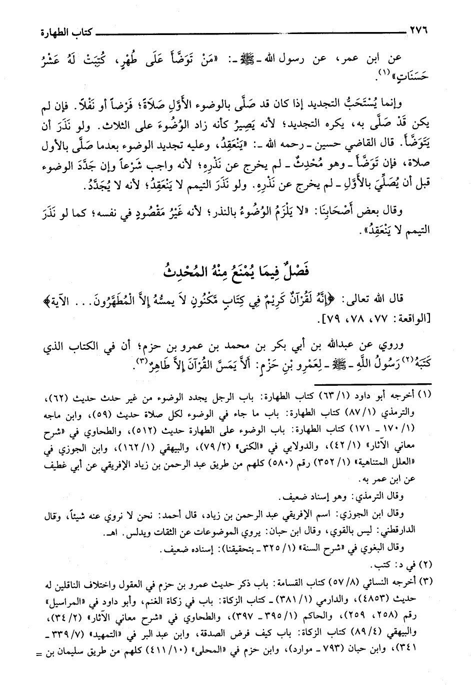 وروي عن عبد الله بن أبي بكر بن محمد بن عمرو بن حزم؛ أن في الكتاب الذي كتبه رسول الله - صلى الله عليه وسلم- لعمرو بن حزمٍ: ألا يمس القرآن إلا طاهرٌ.
