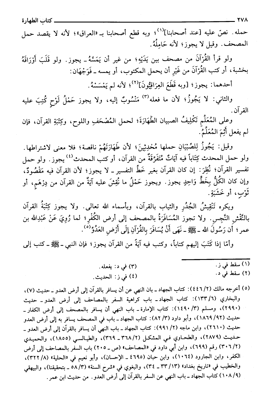 ويكره تنقيش الجدر والثياب بالقرآن، وبأسماء الله تعالى. ولا يجوز كتبة القرآن بالنقش النجس. ولا تجوز المسافرة بالمصحف إلى أرض الكفر؛ لما روي عن عبد الله بن عمر؛ أن رسول الله - صلى الله عليه وسلم- نهى أن يسافر بالقرآن إلى أرض العدو.
