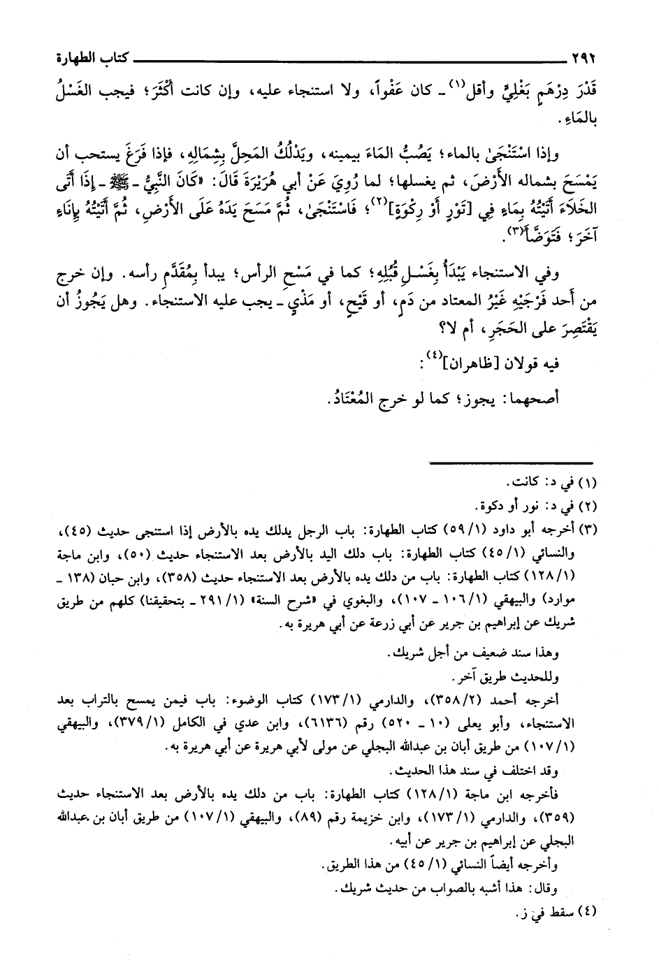 وفي الاستنجاء يبدأ بغسل قبله؛ كما في مسح الرأس؛ يبدأ بمقدم رأسه. وإن خرج من أحد فرجيه غير المعتاد من دمٍ، أو قيحٍ، أو مذي- يجب عليه الاستنجاء. وهل يجوز أن يقتصر على الحجر، أم لا؟