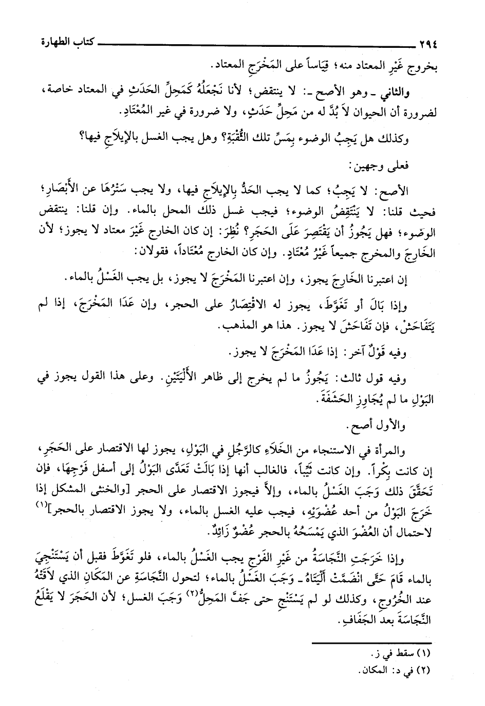 والمرأة في الاستنجاء من الخلاء كالرجل في البول، يجوز لها الاقتصار على الحجر، إن كانت بكراً. وإن كانت ثيباً، فالغالب أنها إذا بالت تعدى البول إلى أسفل فرجها، فإن تحقق ذلك وجب الغسل بالماء، وإلا فيجوز الاقتصار على الحجر [والخنثى المشكل إذا خرج البول من أحد عضويه، فيجب عليه الغسل بالماء، ولا يجوز الاقتصار بالحجر] لاحتمال أن العضو الذي يمسحه بالحجر عضوٌ زائد.