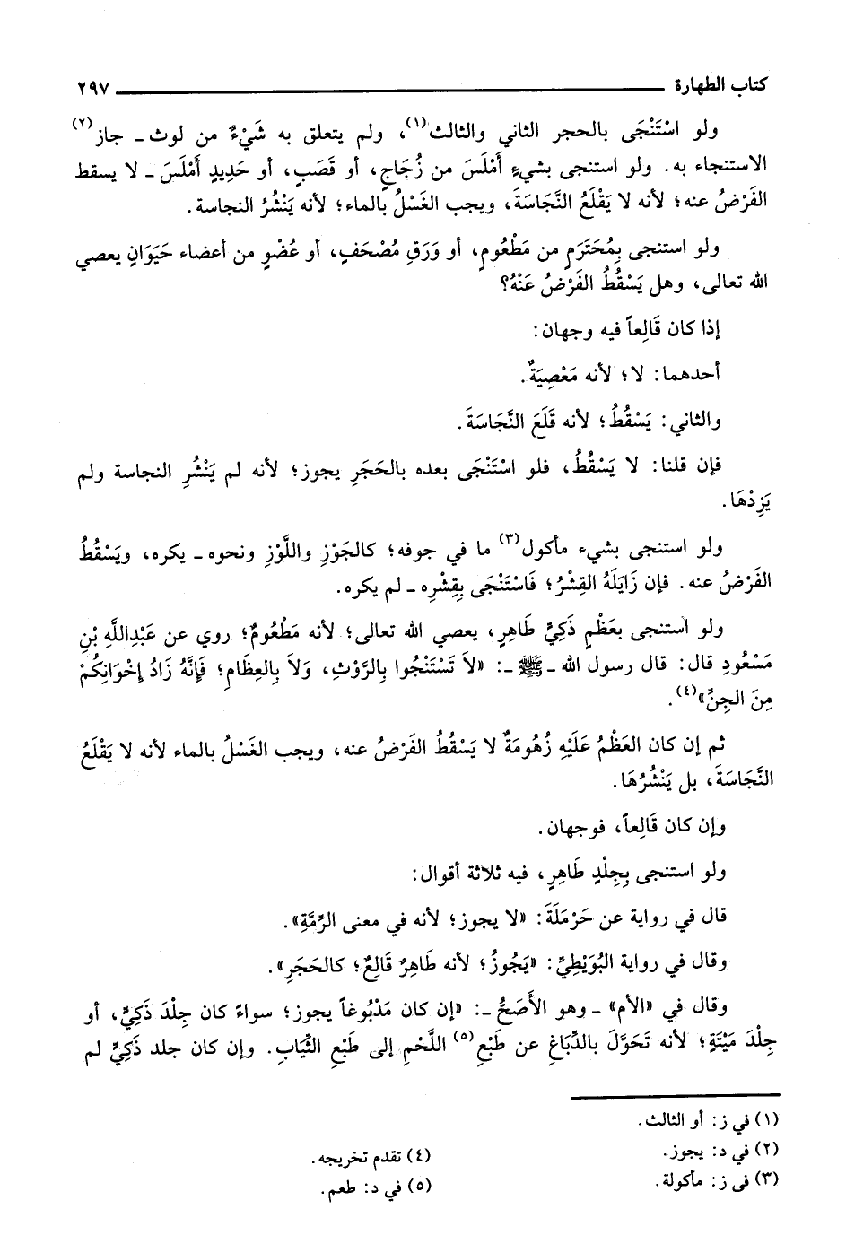 ولو استنجى بعظمٍ ذكي طاهرٍ، يعصي الله تعالى؛ لأنه مطعومٌ؛ روي عن عبد الله بن مسعود قال: قال رسول الله - صلى الله عليه وسلم: "لا تستنجوا بالروث، ولا بالعظام؛ فإنه زاد إخوانكم من الجن".