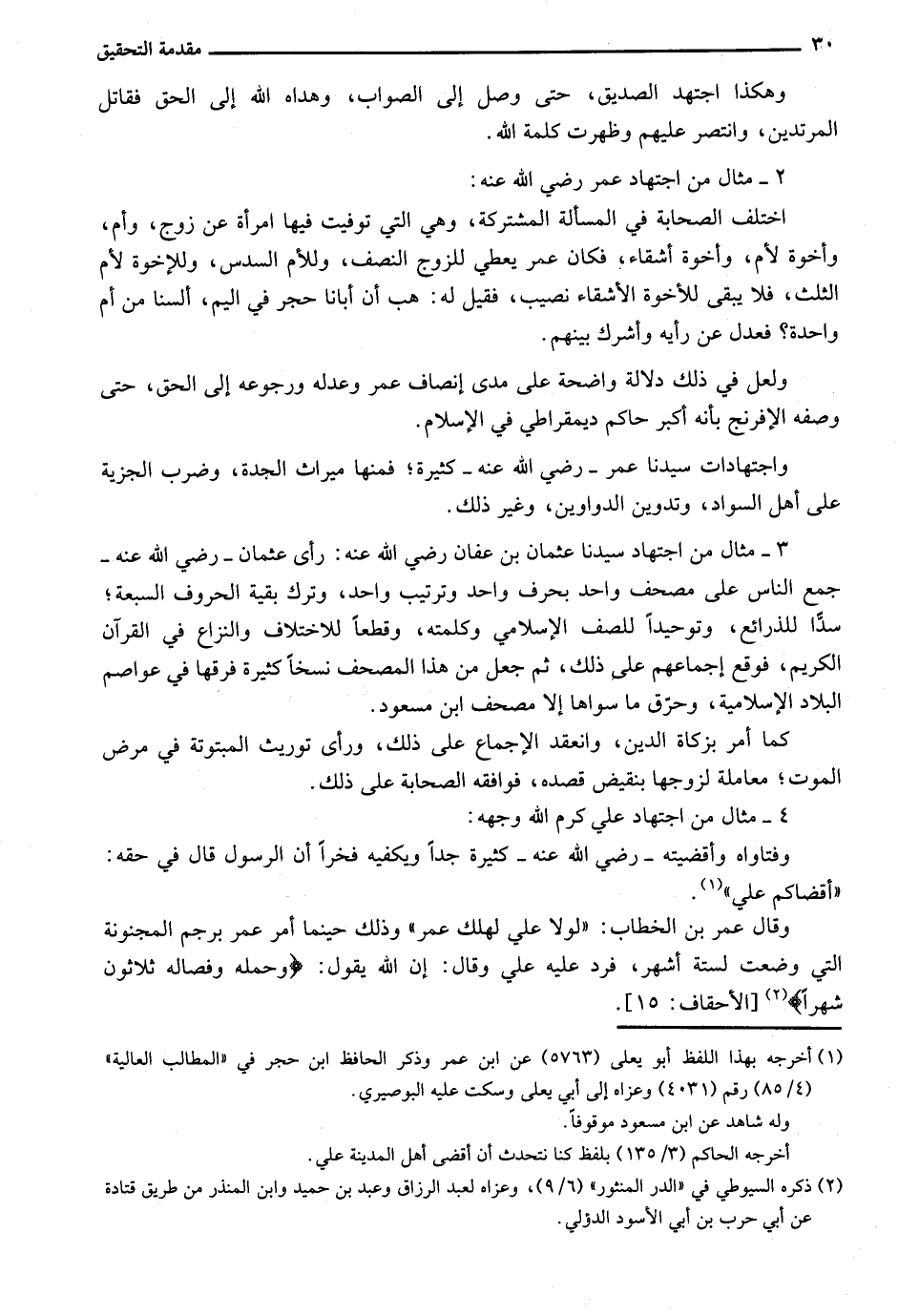 3 - مثال من اجتهاد سيدنا عثمان بن عفان رضي الله عنه: رأى عثمان - رضي الله عنه - جمع الناس على مصحف واحد بحرف واحد وترتيب واحد، وترك بقية الحروف السبعة؛ سداً للذرائع، وتوحيداً للصف الإسلامي وكلمته، وقطعًا للاختلاف والنزاع في القرآن الكريم، فوقع إجماعهم على ذلك، ثم جعل من هذا المصحف نسخًا كثيرة فرقها في عواصم البلاد الإسلامية، وحرق ما سواها إلا مصحف ابن مسعود.