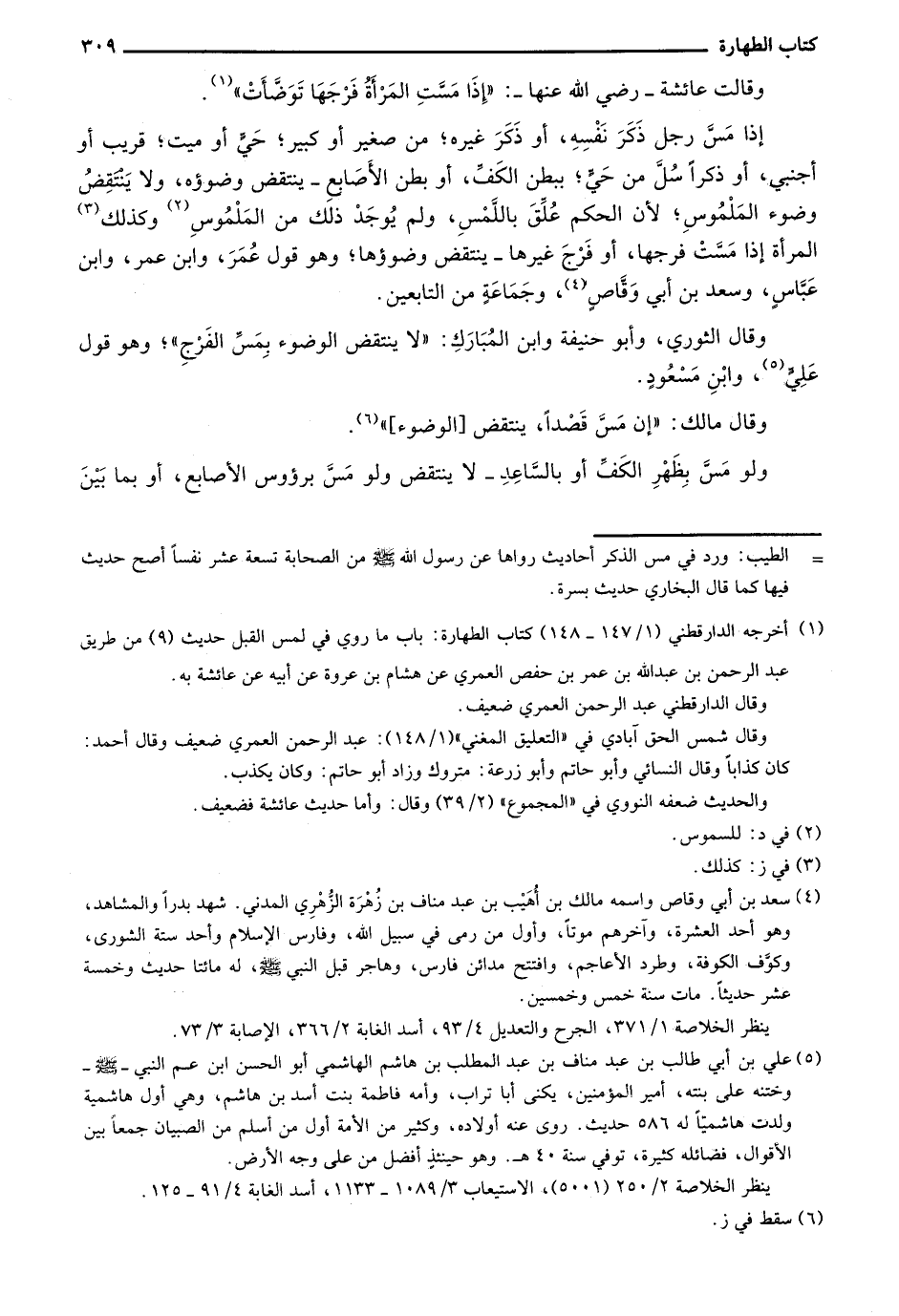 إذا مس رجل ذكر نفسه، أو ذكر غيره؛ من صغير أو كبير؛ حي أو ميت؛ قريب أو أجنبي، أو ذكراً سُل من حي؛ ببطن الكف، أو بطن الأصابع- ينتقض وضوؤه، ولا ينتقض وضوء الملموس؛ لأن الحكم علق باللمس، ولم يوجد ذلك من الملموس وكذلك المرأة إذا مست فرجها، أو فرج غيرها- ينتقض وضوؤها؛ وهو قول عمر، وابن عمر، وابن عباسٍ، وسعد بن أبي وقاصٍ، وجماعةٍ من التابعين.