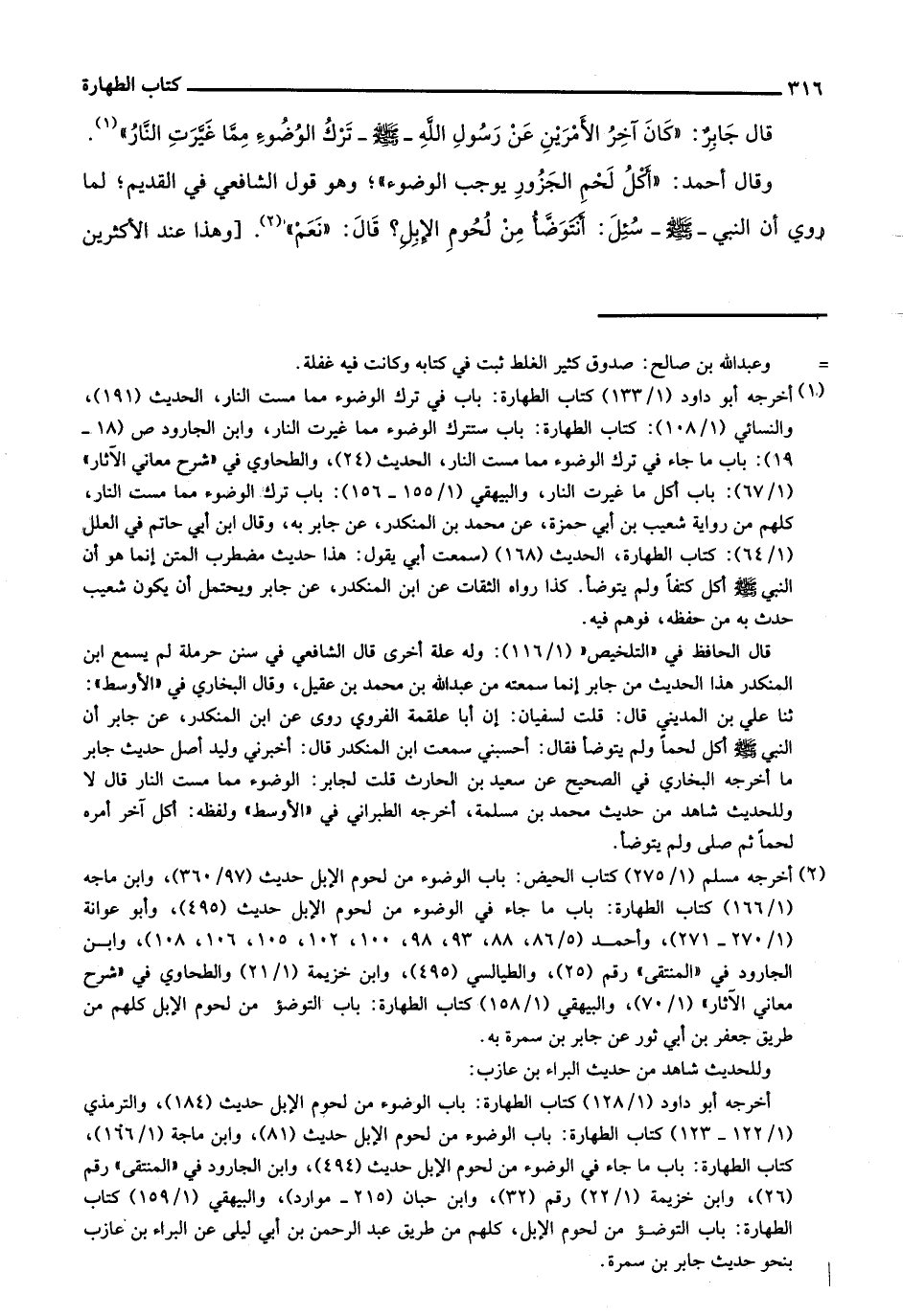 قال جابرٌ: "كان آخر الأمرين عن رسول الله - صلى الله عليه وسلم- ترك الوضوء مما غيرت النار".