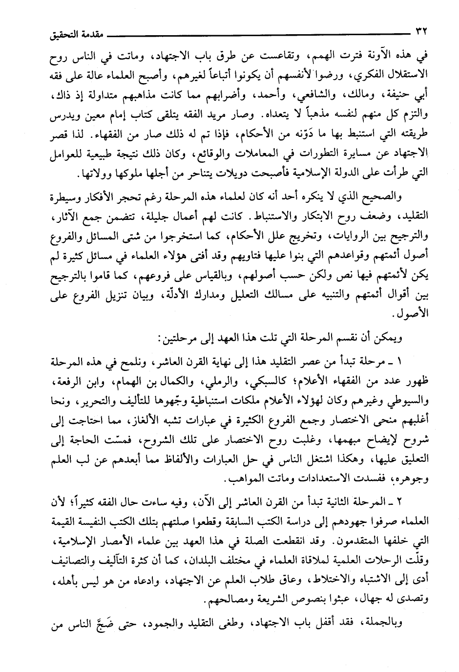 2 - المرحلة الثانية تبدأ من القرن العاشر إلى الآن، وفيه ساءت حال الفقه كثيراً؛ لأن العلماء صرفوا جهودهم إلى دراسة الكتب السابقة وقطعوا صلتهم بتلك الكتب النفيسة القيمة التي خلفها المتقدمون. وقد انقطعت الصلة في هذا العهد بين علماء الأمصار الإسلامية، وقلت الرحلات العلمية لملاقاة العلماء في مختلف البلدان، كما أن كثرة التآليف والتصانيف أدى إلى الاشتباه والاختلاط، وعاق طلاب العلم عن الاجتهاد، وادعاه من هو ليس بأهله، وتصدى له جهال، عبثوا بنصوص الشريعة ومصالحهم.
