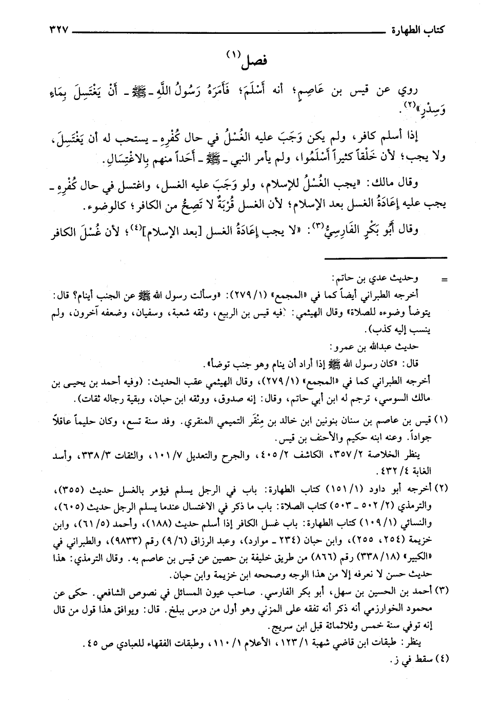 روي عن قيس بن عاصمٍ، أنه أسلم؛ فأمره رسول الله - صلى الله عليه وسلم- أن يغتسل بماءٍ وسدرٍ".