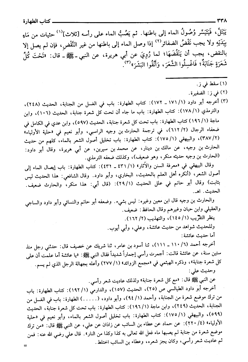 يبتل، فيتيسر وصول الماء إلى باطنها. ثم يصب الماء على رأسه [ثلاث] حثيات من ماءٍ بيديه ولا يجب نقضُ الضفائر إذا وصل الماء إلى باطنها من غير النقض، فإن لم يصل إلا بالنقض، يجب أن ينقضها؛ لما روي عن أبي هريرة، عن النبي - صلى الله عليه وسلم- قال: "تحت كل شعرةٍ جنابةٌ؛ فاغسلوا الشعر، وأنقوا البشر".