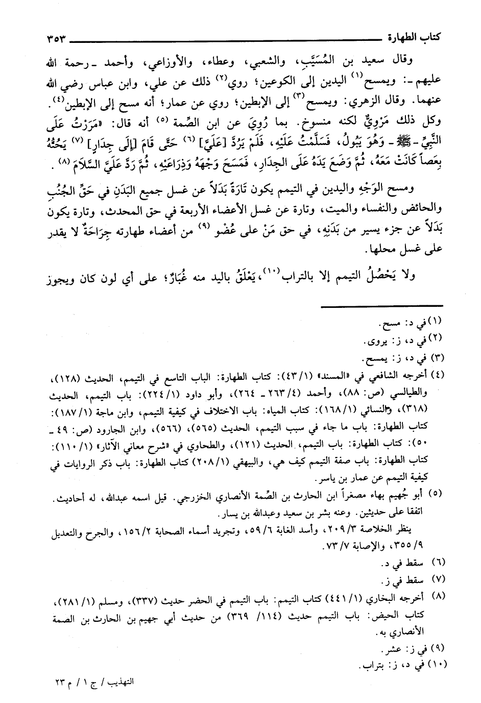 وقال سعيد بن المسيب، والشعبي، وعطاء، والأوزاعي، وأحمد- رحمة الله عليهم-: ويمسح اليدين إلى الكوعين؛ روي ذلك عن علي، وابن عباس رضي الله عنهما. وقال الزهري: ويمسح إلى الإبطين؛ روي عن عمار؛ أنه مسح إلى الإبطين. وكل ذلك مرويٌّ لكنه منسوخ. بما روي عن ابن الصمة أنه قال: "مررت على النبي - صلى الله عليه وسلم- وهو يبول، فسلمت عليه، فلم يرد [عليَّ] حتى قام [إلى جدارٍ] يحثه بعصاً كانت معه، ثم وضع يده على الجدار، فمسح وجهه وذراعيه، ثم رد على السلام.