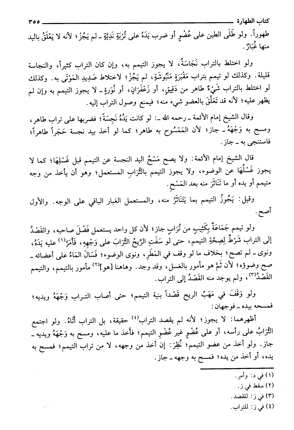 قال الشيخ إمام الأئمة: ولا يصح مسح اليد النجسة عن التيمم قبل غسلها؛ كما لا يجوز غسلها عن الوضوء، ولا يجوز التيمم بالتراب المستعمل؛ وهو أن يأخذ من وجه متيمم أو يده أو ما تناثر منه بعد المسح.
