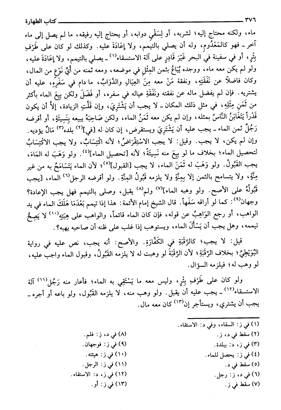 ماء، ولكنه محتاج إليه؛ لشربه، أو لسقي دوابه، أو يحتاج إليه رفيقه، ما لم يصل إلى ماء آخر- فهو كالمعدوم، وله أن يصلي بالتيمم، ولا إعادة عليه. وكذلك لو كان على طرف بئرٍ، أو في سفينة في البحر غير قادرٍ على آلة الاستسقاء- يصلي بالتيمم، ولا إعادة عليه، ولو لم يكن معه ماء، ووجده يباع بثمن المثل في موضعه، ومعه ثمنه من أي نوع من المال، وكان فاضلاً عن نفقته، ونفقة من معه من العياب والدواب، ما دام في سفره، عليه أن يشتريه. فإن لم يفضل ماله عن نفقته ونفقة عياله في سفره، أو فضل ولكن بيع الماء بأكثر من ثمن مثله، في مثل ذلك المكان- لا يجب أن يشتري، وإن قلت الزيادة، إلا أن يكون قدراً يتغابن الناس بمثله، وإن لم يكن معه ثمن الماء، ولكن صاحبه يبيعه بنسيئةٍ، أو أقرضه رجلٌ ثمن الماء- يجب عليه أن يشتري ويستقرض، إن كان له [في] بلده مالٌ يؤديه. وإن لم يكن، لا يجب. وقيل: لا يجب الاستقراض؛ لأنه اكتسابٌ، ولا يجب الاكتساب لتحصيل الماء؛ بخلاف ما لو بيع منه نسيئةً؛ لأنه [تحصيل الماء]. ولو وهب له الماء، يجب القبول. ولو وهب له ثمن الماء، لا يجب [القبول]؛ لأن الماء يتسامح به من غير منةٍ، ولا يتسامح بالثمن إلا بمنةٍ ولا يلزمه قبول المنة. ولو أقرضه الرجل الماء، [يجب قبوله على الأصح. ولو وهبه الماء] ولم يقبل، وصلى بالتيمم فهل يجب الإعادة؟ وجهان: كما لو أراقه سفهاً. قال الشيخ إمام الأئمة: هذا إذا تيمم بعدما هلك الماء في يد الواهب، أو رجع الواهب عن قوله، فإن كان الماء قائماً، والواهب على هبته لا يصح تيممه، وهل يجب أن يسأل الماء، ويستوهب إذا غلب على ظنه أن صاحبه يهبه؟