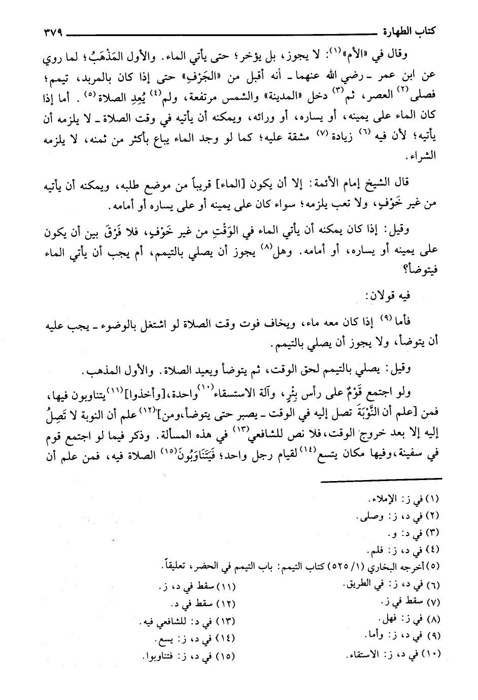 وقال في "الأم": لا يجوز، بل يؤخر؛ حتى يأتي الماء. والأول المذهب؛ لما روي عن ابن عمر- رضي الله عنهما- أنه أقبل من "الجرف" حتى إذا كان بالمربد، تيمم؛ فصلى العصر، ثم دخل "المدينة" والشمس مرتفعة، ولم يُعد الصلاة. أما إذا كان الماء على يمينه، أو يساره، أو ورائه، ويمكنه أن يأتيه في وقت الصلاة- لا يلزمه أن يأتيه؛ لأن فيه زيادة مشقة عليه؛ كما لو وجد الماء يباع بأكثر من ثمنه، لا يلزمه الشراء.