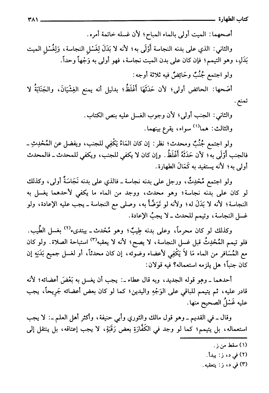 وكذلك لو كان محرماً، وعلى بدنه طيبٌ؛ وهو محدث- يبتدئ بغسل الطيب. فلو تيمم المحدث قبل غسل النجاسة، لا يصح؛ لأنه لا يعقبه استباحة الصلاة. ولو كان مع المسافر من الماء ما لا يكفي لأعضاء وضوئه، إن كان محدثاً، أو لغسل جميع بدنه إن كان جانباً؛ هل يلزمه استعمال؟ فيه قولان: