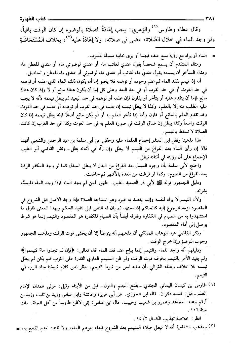 وقال عطاء وطاوس والزهري: يجب إعادة الصلاة بالوضوء إن كان الوقت باقياً، ولو وجد الماء في خلال الصلاة، مضى في صلاته، ولا إعادة عليه، بخلاف المستحاضة