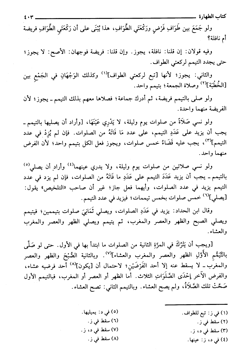 وقال ابن الحداد: يزيد في عدد الصلوات، ويصلي ثماني صلوات بتيممين؛ فيتيمم ويصلي الصبح والظهر والعصر والمغرب، ثم يتيمم ويصلي الظهر والعصر والمغرب والعشاء.