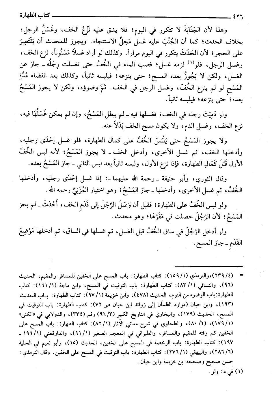 وهذا لأن الجنابة لا تتكرر في اليوم؛ فلا يشق عليه نزع الخف، وغسل الرجل؛ بخلاف الحدث؛ كما أن الجنب عليه غسل محل الاستنجاء. ويجوز للمحدث أن يقتصر على الحجر؛ لأن الحدث يتكرر في اليوم مراراً. وكذلك لو أراد غسلاً مسنوناً، نزع الخف، وغسل الرجل، فلو لزمه غسل؛ فصب الماء في الخف حتى تغسلت رجله- جاز عن الغسل، ولكن لا يجوز بعده المسح؛ حتى ينزعه؛ فيلبسه ثانياً، وكذلك بعد انقضاء مدة المسح لو لم ينزع الخف، وغسل الرجل في الخف. ثم وضوؤه، ولكن لا يجوز المسح بعده؛ حتى ينزعه؛ فيلبسه ثانياً.