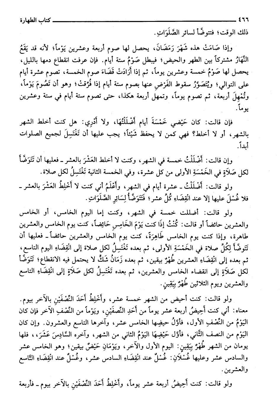 ولو قالت: كنت أحيض من الشهر خمسة عشر، وأخلط أحد النصفين بالآخر بيوم. معناه: أني كنت أحيضُ أربعة عشر يوماً من أحد النصفين، ويوماً من النصف الآخر فإن كان اليوم من النصف الأول، فأول حيضها الخامس عشر، وآخرها التاسع والعشرون. وإن كان اليوم من النصف الثاني، فأول حيضها اليوم الثاني من الشهر، وآخره السادس عشر، فلها يومان من الشهر طهرٌ بيقين: اليوم الأول والآخر، ويومان حيضٌ بيقين؛ وهو الخامس عشر والسادس عشر وعليها غسلان: غسلٌ عند انقضاء السادس عشر، وغسلُ عند انقضاء التاسع والعشرين.