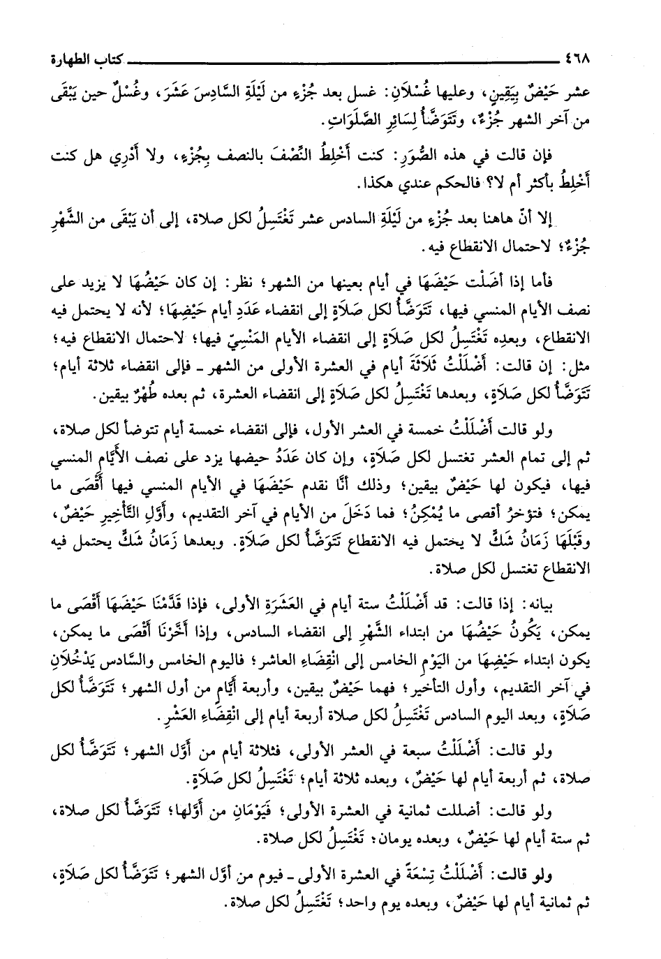 بيانه: إذا قالت: قد أضللت ستة أيام في العشرة الأولى، فإذا قدمنا حيضها أقصى ما يمكن، يكون حيضها من ابتداء الشهر إلى انقضاء السادس، وإذا أخرنا أقصى ما يمكن، يكون ابتداء حيضها من اليوم الخامس إلى انقضاء العاشر؛ فاليوم الخامس والسادس يدخلان في آخر التقديم، وأول التأخير؛ فهما حيضٌ بيقين، وأربعة أيامٍ من أول الشهر؛ تتوضأ لكل صلاةٍ، وبعد اليوم السادس تغتسل لكل صلاة أربعة أيام إلى انقضاء العشر.